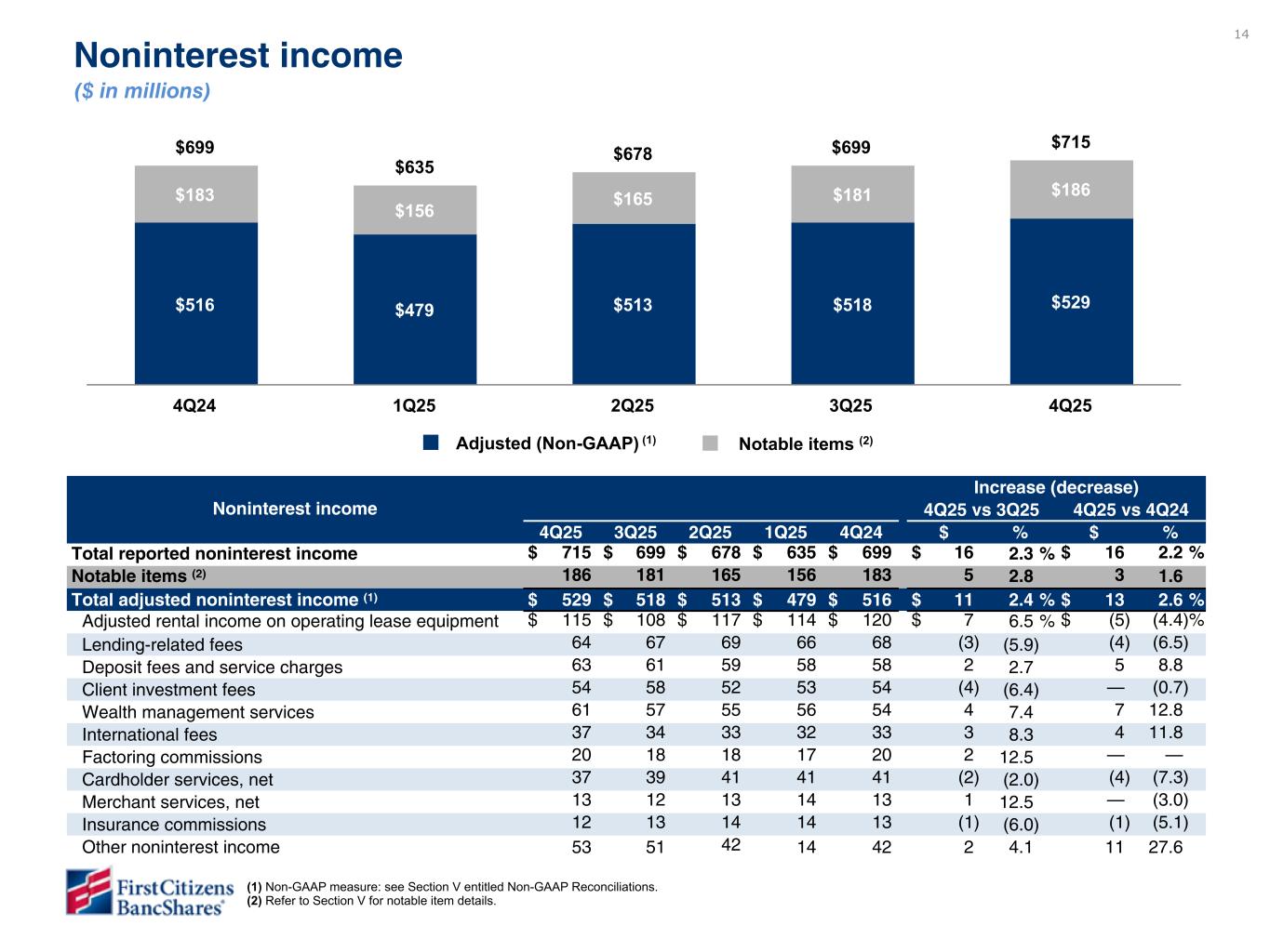 14 $699 $635 $678 $699 $715 $516 $479 $513 $518 $529 $183 $156 $165 $181 $186 4Q24 1Q25 2Q25 3Q25 4Q25 Noninterest income ($ in millions) Adjusted (Non-GAAP) (1) Notable items (2) (1) Non-GAAP measure: see Section V entitled Non-GAAP Reconciliations. (2) Refer to Section V for notable item details. Noninterest income Increase (decrease) 4Q25 vs 3Q25 4Q25 vs 4Q24 4Q25 3Q25 2Q25 1Q25 4Q24 $ % $ % Total reported noninterest income $ 715 $ 699 $ 678 $ 635 $ 699 $ 16 2.3 % $ 16 2.2 % Notable items (2) 186 181 165 156 183 5 2.8 3 1.6 Total adjusted noninterest income (1) $ 529 $ 518 $ 513 $ 479 $ 516 $ 11 2.4 % $ 13 2.6 % Adjusted rental income on operating lease equipment $ 115 $ 108 $ 117 $ 114 $ 120 $ 7 6.5 % $ (5) (4.4) % Lending-related fees 64 67 69 66 68 (3) (5.9) (4) (6.5) Deposit fees and service charges 63 61 59 58 58 2 2.7 5 8.8 Client investment fees 54 58 52 53 54 (4) (6.4) — (0.7) Wealth management services 61 57 55 56 54 4 7.4 7 12.8 International fees 37 34 33 32 33 3 8.3 4 11.8 Factoring commissions 20 18 18 17 20 2 12.5 — — Cardholder services, net 37 39 41 41 41 (2) (2.0) (4) (7.3) Merchant services, net 13 12 13 14 13 1 12.5 — (3.0) Insurance commissions 12 13 14 14 13 (1) (6.0) (1) (5.1) Other noninterest income 53 51 42 14 42 2 4.1 11 27.6