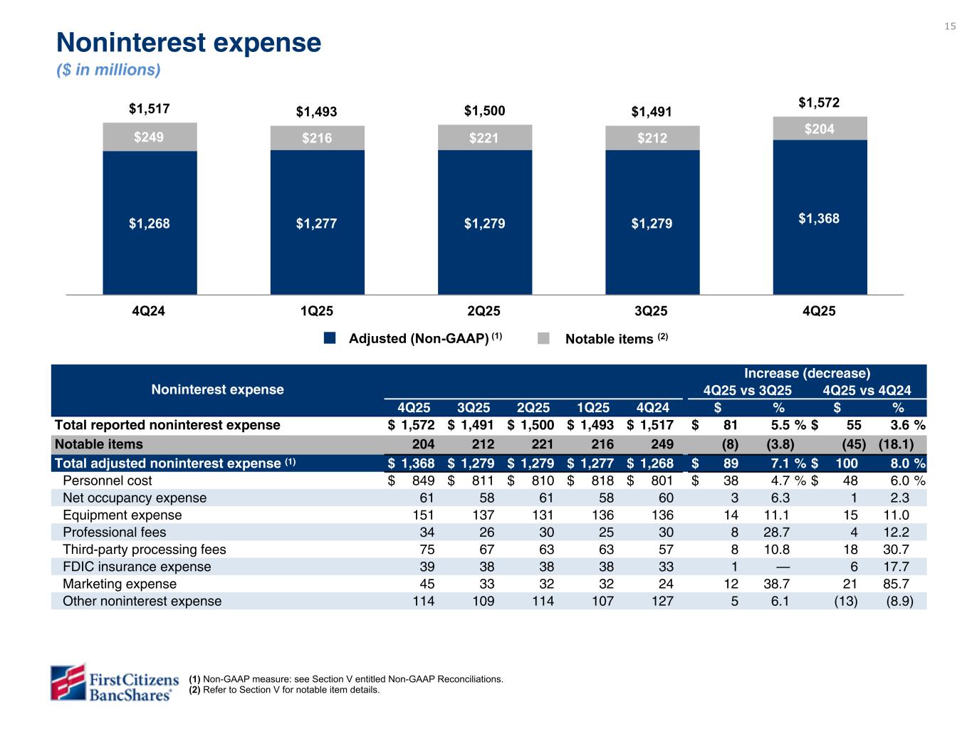 15 $1,517 $1,493 $1,500 $1,491 $1,572 $1,268 $1,277 $1,279 $1,279 $1,368 $249 $216 $221 $212 $204 4Q24 1Q25 2Q25 3Q25 4Q25 Noninterest expense ($ in millions) (1) Non-GAAP measure: see Section V entitled Non-GAAP Reconciliations. (2) Refer to Section V for notable item details. Adjusted (Non-GAAP) (1) Notable items (2) Noninterest expense Increase (decrease) 4Q25 vs 3Q25 4Q25 vs 4Q24 4Q25 3Q25 2Q25 1Q25 4Q24 $ % $ % Total reported noninterest expense $ 1,572 $ 1,491 $ 1,500 $ 1,493 $ 1,517 $ 81 5.5 % $ 55 3.6 % Notable items 204 212 221 216 249 (8) (3.8) (45) (18.1) Total adjusted noninterest expense (1) $ 1,368 $ 1,279 $ 1,279 $ 1,277 $ 1,268 $ 89 7.1 % $ 100 8.0 % Personnel cost $ 849 $ 811 $ 810 $ 818 $ 801 $ 38 4.7 % $ 48 6.0 % Net occupancy expense 61 58 61 58 60 3 6.3 1 2.3 Equipment expense 151 137 131 136 136 14 11.1 15 11.0 Professional fees 34 26 30 25 30 8 28.7 4 12.2 Third-party processing fees 75 67 63 63 57 8 10.8 18 30.7 FDIC insurance expense 39 38 38 38 33 1 — 6 17.7 Marketing expense 45 33 32 32 24 12 38.7 21 85.7 Other noninterest expense 114 109 114 107 127 5 6.1 (13) (8.9)