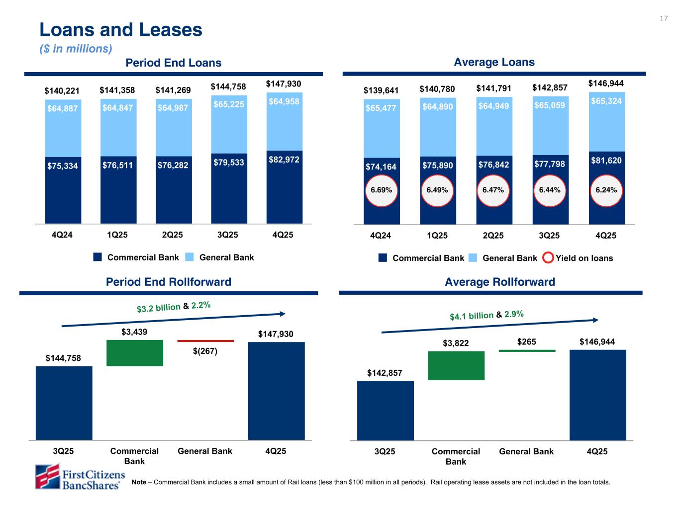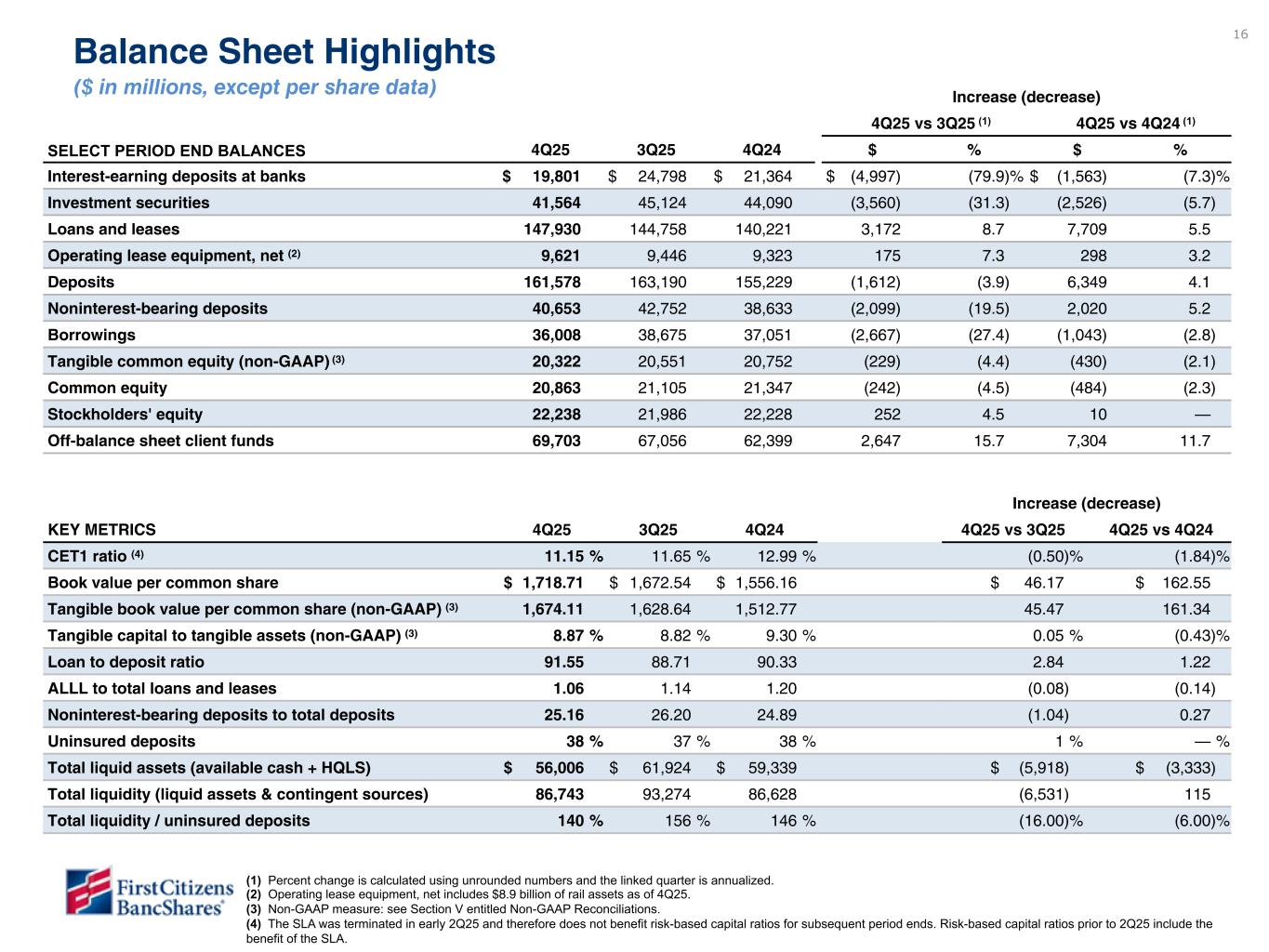 16 Increase (decrease) 4Q25 vs 3Q25 4Q25 vs 4Q24 SELECT PERIOD END BALANCES 4Q25 3Q25 4Q24 $ % $ % Interest-earning deposits at banks $ 19,801 $ 24,798 $ 21,364 $ (4,997) (79.9) % $ (1,563) (7.3) % Investment securities 41,564 45,124 44,090 (3,560) (31.3) (2,526) (5.7) Loans and leases 147,930 144,758 140,221 3,172 8.7 7,709 5.5 Operating lease equipment, net (2) 9,621 9,446 9,323 175 7.3 298 3.2 Deposits 161,578 163,190 155,229 (1,612) (3.9) 6,349 4.1 Noninterest-bearing deposits 40,653 42,752 38,633 (2,099) (19.5) 2,020 5.2 Borrowings 36,008 38,675 37,051 (2,667) (27.4) (1,043) (2.8) Tangible common equity (non-GAAP) (3) 20,322 20,551 20,752 (229) (4.4) (430) (2.1) Common equity 20,863 21,105 21,347 (242) (4.5) (484) (2.3) Stockholders' equity 22,238 21,986 22,228 252 4.5 10 — Off-balance sheet client funds 69,703 67,056 62,399 2,647 15.7 7,304 11.7 Increase (decrease) KEY METRICS 4Q25 3Q25 4Q24 4Q25 vs 3Q25 4Q25 vs 4Q24 CET1 ratio (4) 11.15 % 11.65 % 12.99 % (0.50) % (1.84) % Book value per common share $ 1,718.71 $ 1,672.54 $ 1,556.16 $ 46.17 $ 162.55 Tangible book value per common share (non-GAAP) (3) 1,674.11 1,628.64 1,512.77 45.47 161.34 Tangible capital to tangible assets (non-GAAP) (3) 8.87 % 8.82 % 9.30 % 0.05 % (0.43) % Loan to deposit ratio 91.55 88.71 90.33 2.84 1.22 ALLL to total loans and leases 1.06 1.14 1.20 (0.08) (0.14) Noninterest-bearing deposits to total deposits 25.16 26.20 24.89 (1.04) 0.27 Uninsured deposits 38 % 37 % 38 % 1 % — % Total liquid assets (available cash + HQLS) $ 56,006 $ 61,924 $ 59,339 $ (5,918) $ (3,333) Total liquidity (liquid assets & contingent sources) 86,743 93,274 86,628 (6,531) 115 Total liquidity / uninsured deposits 140 % 156 % 146 % (16.00) % (6.00) % Balance Sheet Highlights ($ in millions, except per share data) (1) (1) (1) Percent change is calculated using unrounded numbers and the linked quarter is annualized. (2) Operating lease equipment, net includes $8.9 billion of rail assets as of 4Q25. (3) Non-GAAP measure: see Section V entitled Non-GAAP Reconciliations. (4) The SLA was terminated in early 2Q25 and therefore does not benefit risk-based capital ratios for subsequent period ends. Risk-based capital ratios prior to 2Q25 include the benefit of the SLA.