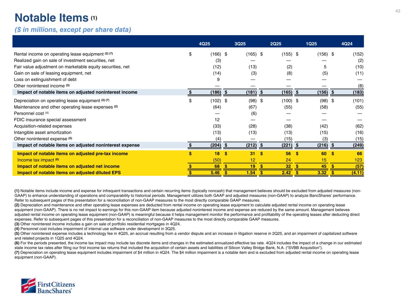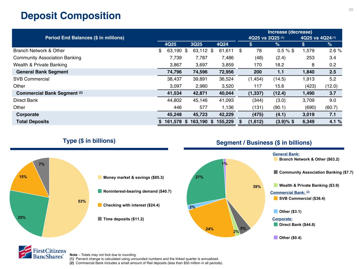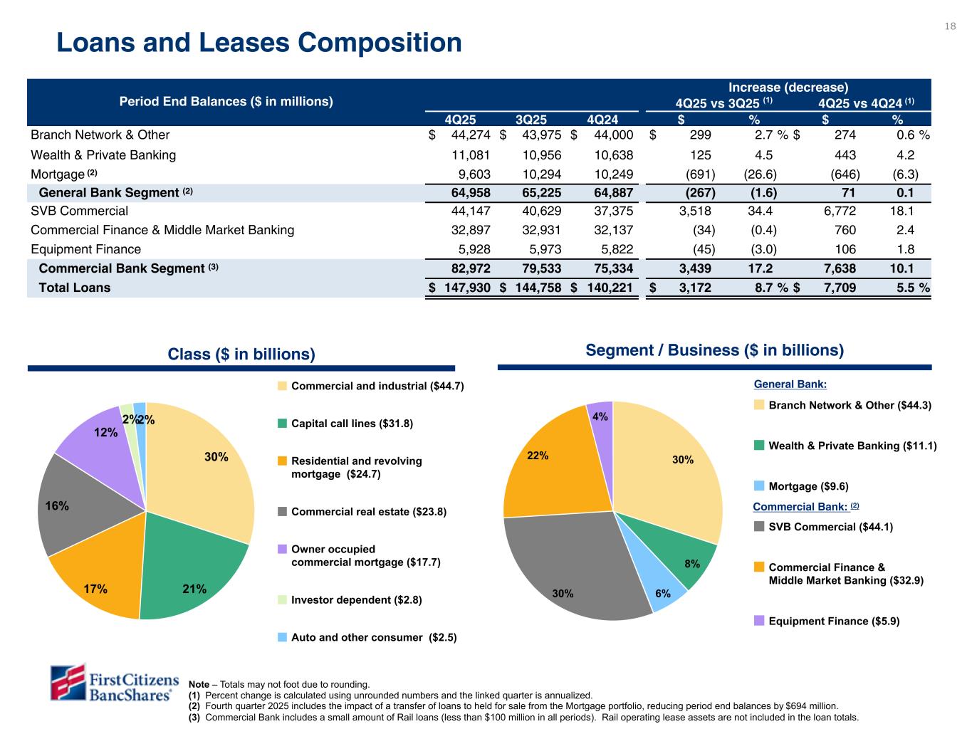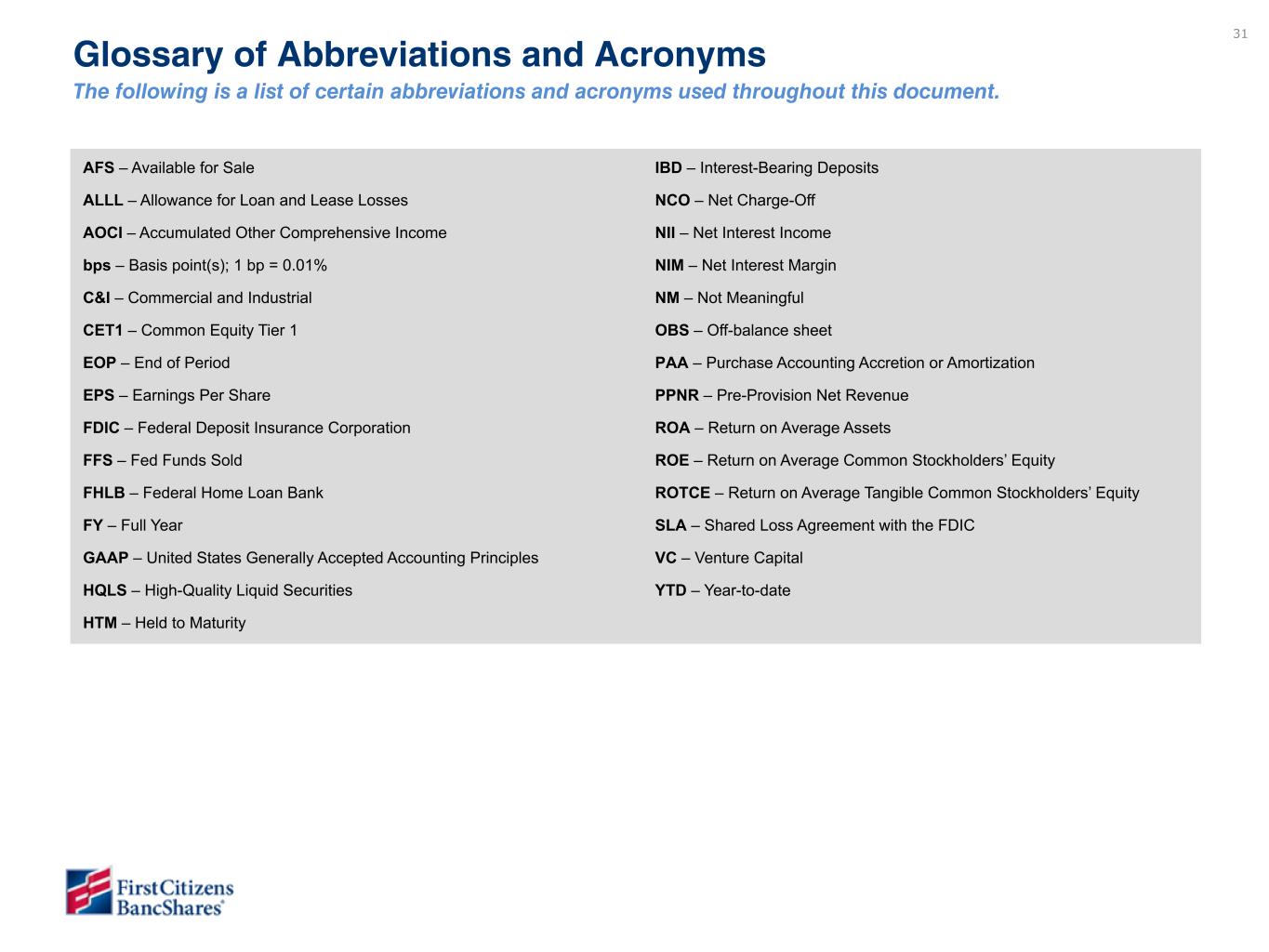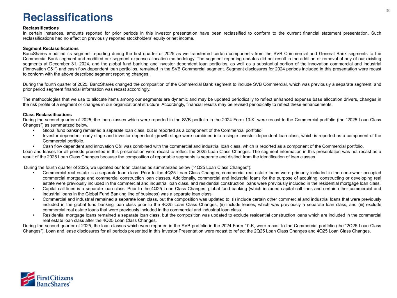 30 Reclassifications In certain instances, amounts reported for prior periods in this investor presentation have been reclassified to conform to the current financial statement presentation. Such reclassifications had no effect on previously reported stockholders’ equity or net income. Segment Reclassifications BancShares modified its segment reporting during the first quarter of 2025 as we transferred certain components from the SVB Commercial and General Bank segments to the Commercial Bank segment and modified our segment expense allocation methodology. The segment reporting updates did not result in the addition or removal of any of our existing segments at December 31, 2024, and the global fund banking and investor dependent loan portfolios, as well as a substantial portion of the innovation commercial and industrial (“innovation C&I”) and cash flow dependent loan portfolios, remained in the SVB Commercial segment. Segment disclosures for 2024 periods included in this presentation were recast to conform with the above described segment reporting changes. During the fourth quarter of 2025, BancShares changed the composition of the Commercial Bank segment to include SVB Commercial, which was previously a separate segment, and prior period segment financial information was recast accordingly. The methodologies that we use to allocate items among our segments are dynamic and may be updated periodically to reflect enhanced expense base allocation drivers, changes in the risk profile of a segment or changes in our organizational structure. Accordingly, financial results may be revised periodically to reflect these enhancements. Class Reclassifications During the second quarter of 2025, the loan classes which were reported in the SVB portfolio in the 2024 Form 10-K, were recast to the Commercial portfolio (the “2025 Loan Class Changes”) as summarized below. • Global fund banking remained a separate loan class, but is reported as a component of the Commercial portfolio. • Investor dependent–early stage and investor dependent–growth stage were combined into a single investor dependent loan class, which is reported as a component of the Commercial portfolio. • Cash flow dependent and innovation C&I was combined with the commercial and industrial loan class, which is reported as a component of the Commercial portfolio. Loan and leases for all periods presented in this presentation were recast to reflect the 2025 Loan Class Changes. The segment information in this presentation was not recast as a result of the 2025 Loan Class Changes because the composition of reportable segments is separate and distinct from the identification of loan classes. During the fourth quarter of 2025, we updated our loan classes as summarized below (“4Q25 Loan Class Changes”): • Commercial real estate is a separate loan class. Prior to the 4Q25 Loan Class Changes, commercial real estate loans were primarily included in the non-owner occupied commercial mortgage and commercial construction loan classes. Additionally, commercial and industrial loans for the purpose of acquiring, constructing or developing real estate were previously included in the commercial and industrial loan class, and residential construction loans were previously included in the residential mortgage loan class. • Capital call lines is a separate loan class. Prior to the 4Q25 Loan Class Changes, global fund banking (which included capital call lines and certain other commercial and industrial loans in the Global Fund Banking line of business) was a separate loan class. • Commercial and industrial remained a separate loan class, but the composition was updated to: (i) include certain other commercial and industrial loans that were previously included in the global fund banking loan class prior to the 4Q25 Loan Class Changes, (ii) include leases, which was previously a separate loan class, and (iii) exclude commercial real estate loans that were previously included in the commercial and industrial loan class. • Residential mortgage loans remained a separate loan class, but the composition was updated to exclude residential construction loans which are included in the commercial real estate loan class after the 4Q25 Loan Class Changes. During the second quarter of 2025, the loan classes which were reported in the SVB portfolio in the 2024 Form 10-K, were recast to the Commercial portfolio (the “2Q25 Loan Class Changes”). Loan and lease disclosures for all periods presented in this Investor Presentation were recast to reflect the 2Q25 Loan Class Changes and 4Q25 Loan Class Changes. Reclassifications