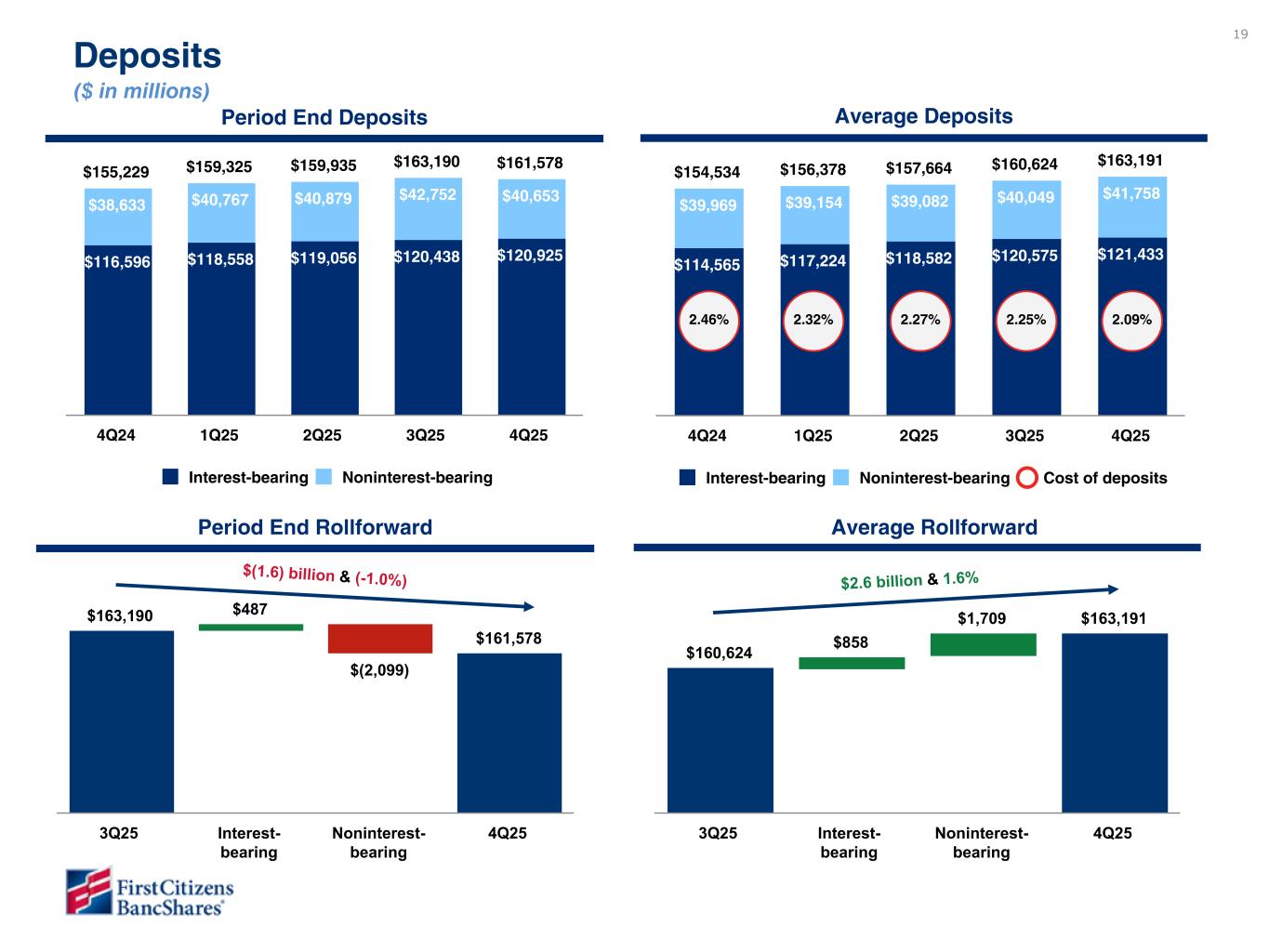 18 30% 8% 6%30% 22% 4% Branch Network & Other ($44.3) Wealth & Private Banking ($11.1) Mortgage ($9.6) SVB Commercial ($44.1) Commercial Finance & Middle Market Banking ($32.9) Equipment Finance ($5.9) Loans and Leases Composition Period End Balances ($ in millions) Increase (decrease) 4Q25 vs 3Q25 4Q25 vs 4Q24 4Q25 3Q25 4Q24 $ % $ % Branch Network & Other $ 44,274 $ 43,975 $ 44,000 $ 299 2.7 % $ 274 0.6 % Wealth & Private Banking 11,081 10,956 10,638 125 4.5 443 4.2 Mortgage (2) 9,603 10,294 10,249 (691) (26.6) (646) (6.3) General Bank Segment (2) 64,958 65,225 64,887 (267) (1.6) 71 0.1 SVB Commercial 44,147 40,629 37,375 3,518 34.4 6,772 18.1 Commercial Finance & Middle Market Banking 32,897 32,931 32,137 (34) (0.4) 760 2.4 Equipment Finance 5,928 5,973 5,822 (45) (3.0) 106 1.8 Commercial Bank Segment (3) 82,972 79,533 75,334 3,439 17.2 7,638 10.1 Total Loans $ 147,930 $ 144,758 $ 140,221 $ 3,172 8.7 % $ 7,709 5.5 % Note – Totals may not foot due to rounding. (1) Percent change is calculated using unrounded numbers and the linked quarter is annualized. (2) Fourth quarter 2025 includes the impact of a transfer of loans to held for sale from the Mortgage portfolio, reducing period end balances by $694 million. (3) Commercial Bank includes a small amount of Rail loans (less than $100 million in all periods). Rail operating lease assets are not included in the loan totals. Segment / Business ($ in billions) Commercial Bank: (2) General Bank: Class ($ in billions) 30% 21%17% 16% 12% 2%2% Commercial and industrial ($44.7) Capital call lines ($31.8) Residential and revolving mortgage ($24.7) Commercial real estate ($23.8) Owner occupied commercial mortgage ($17.7) Investor dependent ($2.8) Auto and other consumer ($2.5) (1) (1)