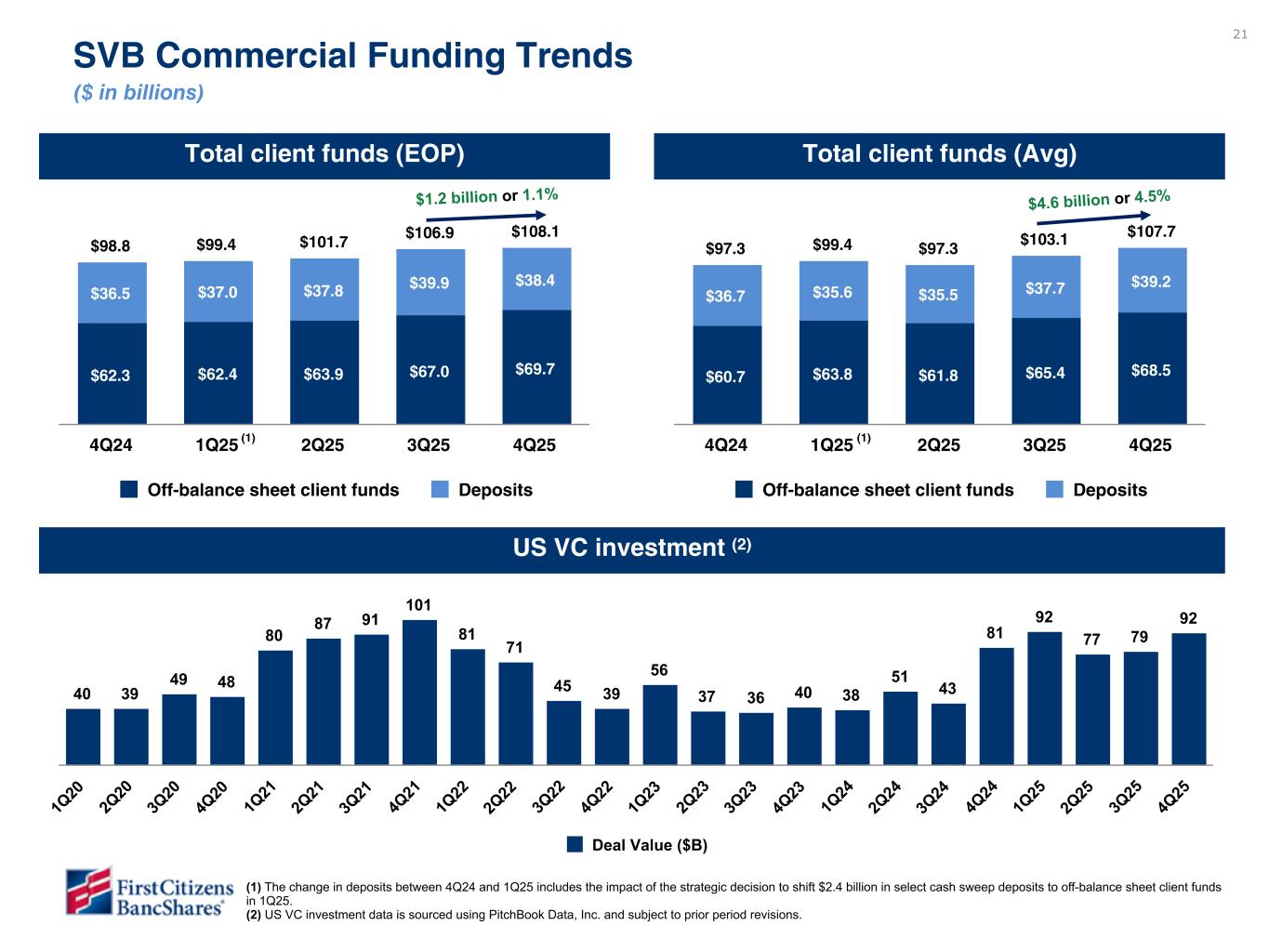 21 US VC investment (2) Total client funds (Avg)Total client funds (EOP) SVB Commercial Funding Trends ($ in billions) $98.8 $99.4 $101.7 $106.9 $108.1 $62.3 $62.4 $63.9 $67.0 $69.7 $36.5 $37.0 $37.8 $39.9 $38.4 Off-balance sheet client funds Deposits 4Q24 1Q25 2Q25 3Q25 4Q25 $97.3 $99.4 $97.3 $103.1 $107.7 $60.7 $63.8 $61.8 $65.4 $68.5 $36.7 $35.6 $35.5 $37.7 $39.2 Off-balance sheet client funds Deposits 4Q24 1Q25 2Q25 3Q25 4Q25 40 39 49 48 80 87 91 101 81 71 45 39 56 37 36 40 38 51 43 81 92 77 79 92 Deal Value ($B) 1Q 20 2Q 20 3Q 20 4Q 20 1Q 21 2Q 21 3Q 21 4Q 21 1Q 22 2Q 22 3Q 22 4Q 22 1Q 23 2Q 23 3Q 23 4Q 23 1Q 24 2Q 24 3Q 24 4Q 24 1Q 25 2Q 25 3Q 25 4Q 25 $1.2 billion or 1.1% $4.6 billion or 4.5% (1) The change in deposits between 4Q24 and 1Q25 includes the impact of the strategic decision to shift $2.4 billion in select cash sweep deposits to off-balance sheet client funds in 1Q25. (2) US VC investment data is sourced using PitchBook Data, Inc. and subject to prior period revisions. (1) (1)