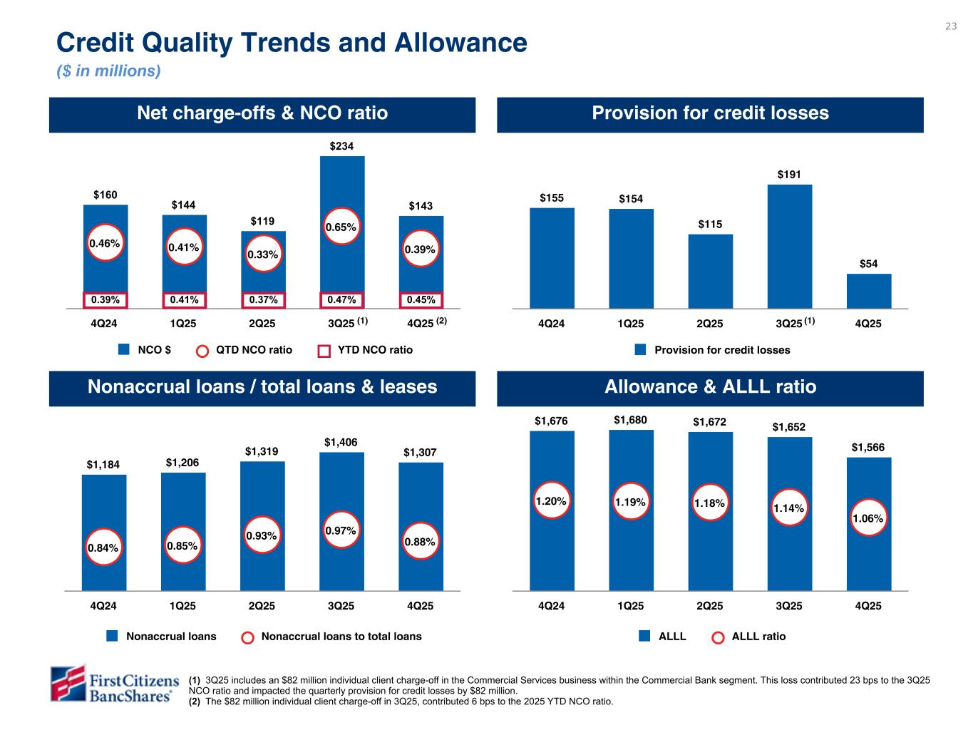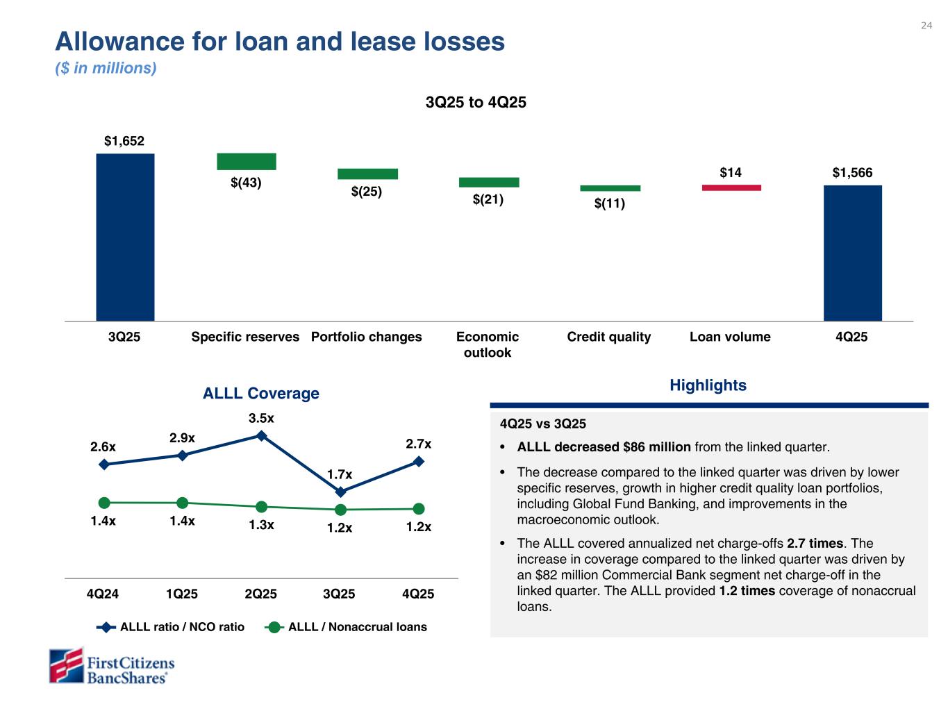 23 $155 $154 $115 $191 $54 Provision for credit losses 4Q24 1Q25 2Q25 3Q25 4Q25 Credit Quality Trends and Allowance ($ in millions) Net charge-offs & NCO ratio Provision for credit losses $160 $144 $119 $234 $143 0.46% 0.41% 0.33% 0.65% 0.39% NCO $ QTD NCO ratio YTD NCO ratio 4Q24 1Q25 2Q25 3Q25 4Q25 Nonaccrual loans / total loans & leases Allowance & ALLL ratio $1,676 $1,680 $1,672 $1,652 $1,566 1.20% 1.19% 1.18% 1.14% 1.06% ALLL ALLL ratio 4Q24 1Q25 2Q25 3Q25 4Q25 0.45%0.39% 0.41% 0.37% 0.47% $1,184 $1,206 $1,319 $1,406 $1,307 0.84% 0.85% 0.93% 0.97% 0.88% Nonaccrual loans Nonaccrual loans to total loans 4Q24 1Q25 2Q25 3Q25 4Q25 (1) 3Q25 includes an $82 million individual client charge-off in the Commercial Services business within the Commercial Bank segment. This loss contributed 23 bps to the 3Q25 NCO ratio and impacted the quarterly provision for credit losses by $82 million. (2) The $82 million individual client charge-off in 3Q25, contributed 6 bps to the 2025 YTD NCO ratio. (1) (1)(2)