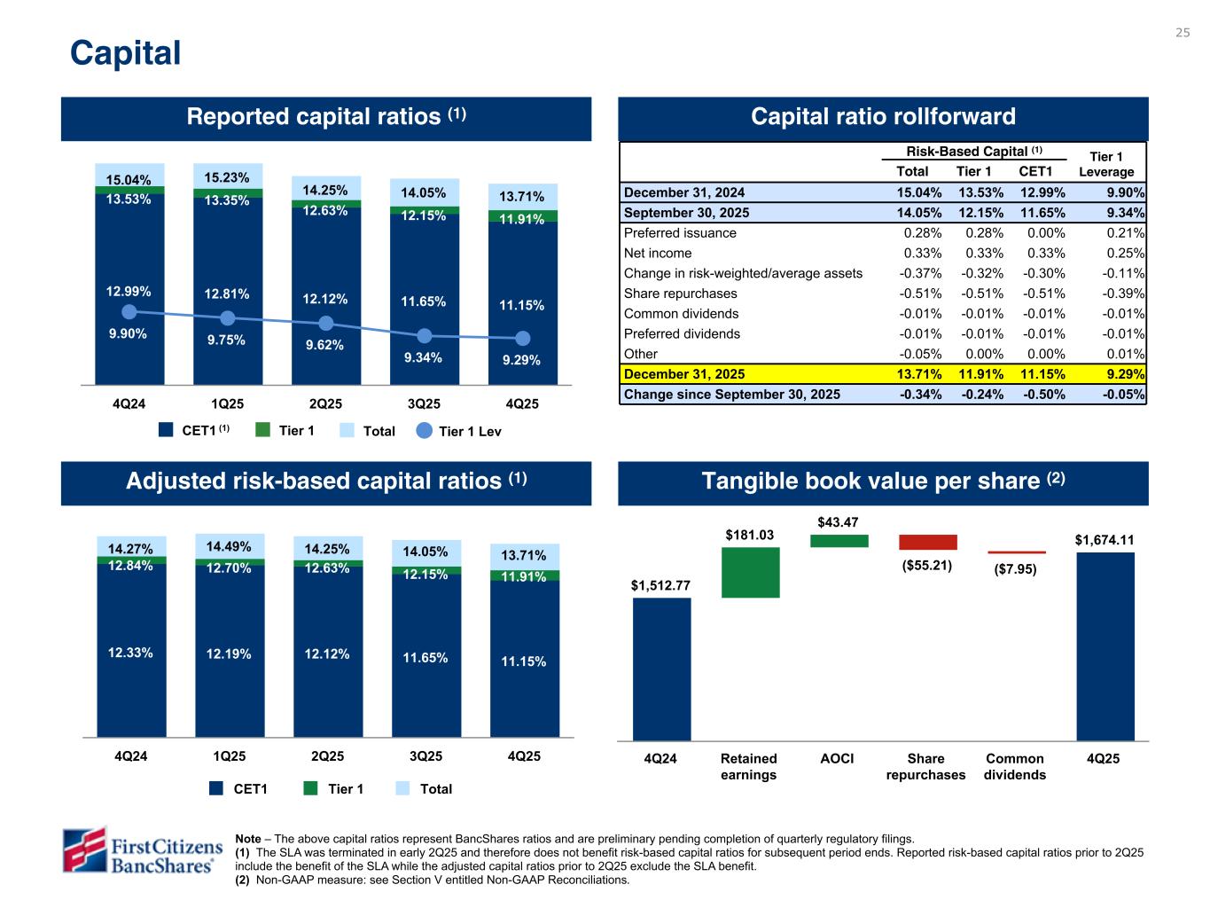 25 Reported capital ratios (1) Capital ratio rollforward Adjusted risk-based capital ratios (1) Tangible book value per share (2) Capital Risk-Based Capital (1) Tier 1 Leverage Total Tier 1 CET1 December 31, 2024 15.04 % 13.53 % 12.99 % 9.90 % September 30, 2025 14.05 % 12.15 % 11.65 % 9.34 % Preferred issuance 0.28 % 0.28 % 0.00 % 0.21 % Net income 0.33 % 0.33 % 0.33 % 0.25 % Change in risk-weighted/average assets -0.37 % -0.32 % -0.30 % -0.11 % Share repurchases -0.51 % -0.51 % -0.51 % -0.39 % Common dividends -0.01 % -0.01 % -0.01 % -0.01 % Preferred dividends -0.01 % -0.01 % -0.01 % -0.01 % Other -0.05 % 0.00 % 0.00 % 0.01 % December 31, 2025 13.71 % 11.91 % 11.15 % 9.29 % Change since September 30, 2025 -0.34 % -0.24 % -0.50 % -0.05 % 12.99% 12.81% 12.12% 11.65% 11.15% 13.53% 13.35% 12.63% 12.15% 11.91% 15.04% 15.23% 14.25% 14.05% 13.71% 4Q24 1Q25 2Q25 3Q25 4Q25 $1,512.77 $181.03 $43.47 ($55.21) ($7.95) $1,674.11 4Q24 Retained earnings AOCI Share repurchases Common dividends 4Q25 Note – The above capital ratios represent BancShares ratios and are preliminary pending completion of quarterly regulatory filings. (1) The SLA was terminated in early 2Q25 and therefore does not benefit risk-based capital ratios for subsequent period ends. Reported risk-based capital ratios prior to 2Q25 include the benefit of the SLA while the adjusted capital ratios prior to 2Q25 exclude the SLA benefit. (2) Non-GAAP measure: see Section V entitled Non-GAAP Reconciliations. 9.90% 9.75% 9.62% 9.34% 9.29% Tier 1 Lev 12.33% 12.19% 12.12% 11.65% 11.15% 12.84% 12.70% 12.63% 12.15% 11.91% 14.27% 14.49% 14.25% 14.05% 13.71% CET1 Tier 1 Total 4Q24 1Q25 2Q25 3Q25 4Q25 CET1 (1) Tier 1 Total