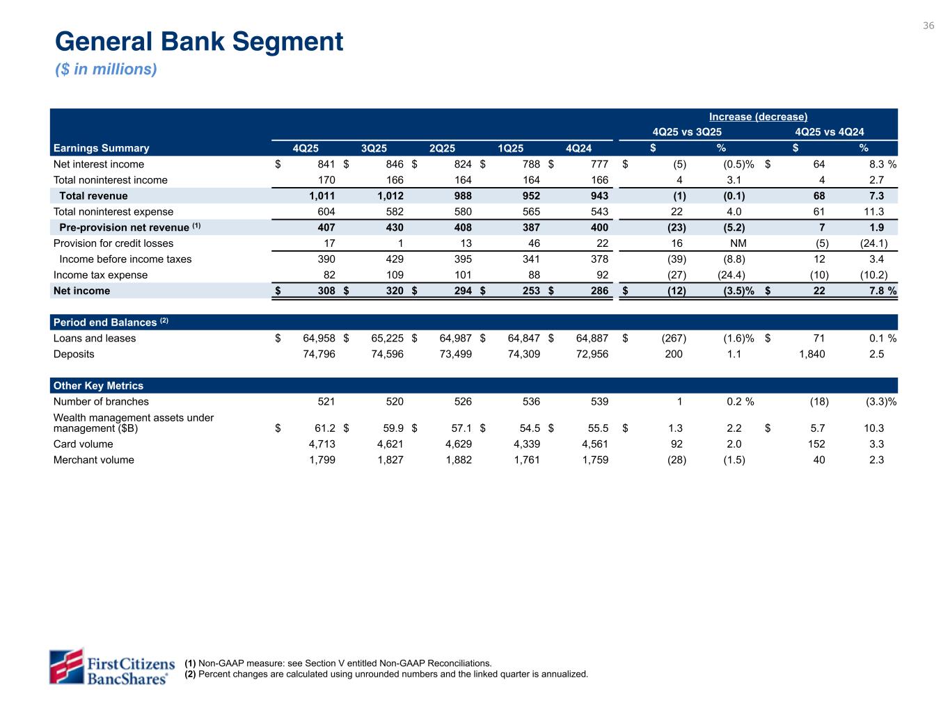 36 General Bank Segment ($ in millions) (1) Non-GAAP measure: see Section V entitled Non-GAAP Reconciliations. (2) Percent changes are calculated using unrounded numbers and the linked quarter is annualized. Increase (decrease) 4Q25 vs 3Q25 4Q25 vs 4Q24 Earnings Summary 4Q25 3Q25 2Q25 1Q25 4Q24 $ % $ % Net interest income $ 841 $ 846 $ 824 $ 788 $ 777 $ (5) (0.5) % $ 64 8.3 % Total noninterest income 170 166 164 164 166 4 3.1 4 2.7 Total revenue 1,011 1,012 988 952 943 (1) (0.1) 68 7.3 Total noninterest expense 604 582 580 565 543 22 4.0 61 11.3 Pre-provision net revenue (1) 407 430 408 387 400 (23) (5.2) 7 1.9 Provision for credit losses 17 1 13 46 22 16 NM (5) (24.1) Income before income taxes 390 429 395 341 378 (39) (8.8) 12 3.4 Income tax expense 82 109 101 88 92 (27) (24.4) (10) (10.2) Net income $ 308 $ 320 $ 294 $ 253 $ 286 $ (12) (3.5) % $ 22 7.8 % Period end Balances (2) Loans and leases $ 64,958 $ 65,225 $ 64,987 $ 64,847 $ 64,887 $ (267) (1.6) % $ 71 0.1 % Deposits 74,796 74,596 73,499 74,309 72,956 200 1.1 1,840 2.5 Other Key Metrics Number of branches 521 520 526 536 539 1 0.2 % (18) (3.3) % Wealth management assets under management ($B) $ 61.2 $ 59.9 $ 57.1 $ 54.5 $ 55.5 $ 1.3 2.2 $ 5.7 10.3 Card volume 4,713 4,621 4,629 4,339 4,561 92 2.0 152 3.3 Merchant volume 1,799 1,827 1,882 1,761 1,759 (28) (1.5) 40 2.3