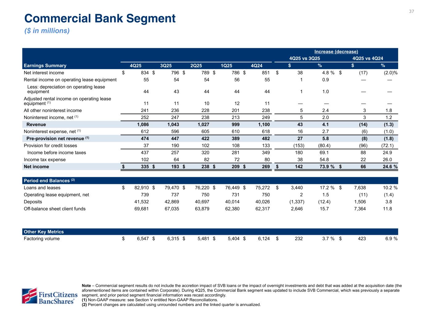 37 Increase (decrease) 4Q25 vs 3Q25 4Q25 vs 4Q24 Earnings Summary 4Q25 3Q25 2Q25 1Q25 4Q24 $ % $ % Net interest income $ 834 $ 796 $ 789 $ 786 $ 851 $ 38 4.8 % $ (17) (2.0) % Rental income on operating lease equipment 55 54 54 56 55 1 0.9 — — Less: depreciation on operating lease equipment 44 43 44 44 44 1 1.0 — — Adjusted rental income on operating lease equipment (1) 11 11 10 12 11 — — — — All other noninterest income 241 236 228 201 238 5 2.4 3 1.8 Noninterest income, net (1) 252 247 238 213 249 5 2.0 3 1.2 Revenue 1,086 1,043 1,027 999 1,100 43 4.1 (14) (1.3) Noninterest expense, net (1) 612 596 605 610 618 16 2.7 (6) (1.0) Pre-provision net revenue (1) 474 447 422 389 482 27 5.8 (8) (1.8) Provision for credit losses 37 190 102 108 133 (153) (80.4) (96) (72.1) Income before income taxes 437 257 320 281 349 180 69.1 88 24.9 Income tax expense 102 64 82 72 80 38 54.8 22 26.0 Net income $ 335 $ 193 $ 238 $ 209 $ 269 $ 142 73.9 % $ 66 24.6 % Period end Balances (2) Loans and leases $ 82,910 $ 79,470 $ 76,220 $ 76,449 $ 75,272 $ 3,440 17.2 % $ 7,638 10.2 % Operating lease equipment, net 739 737 750 731 750 2 1.5 (11) (1.4) Deposits 41,532 42,869 40,697 40,014 40,026 (1,337) (12.4) 1,506 3.8 Off-balance sheet client funds 69,681 67,035 63,879 62,380 62,317 2,646 15.7 7,364 11.8 Other Key Metrics Factoring volume $ 6,547 $ 6,315 $ 5,481 $ 5,404 $ 6,124 $ 232 3.7 % $ 423 6.9 % Commercial Bank Segment ($ in millions) Note – Commercial segment results do not include the accretion impact of SVB loans or the impact of overnight investments and debt that was added at the acquisition date (the aforementioned items are contained within Corporate). During 4Q25, the Commercial Bank segment was updated to include SVB Commercial, which was previously a separate segment, and prior period segment financial information was recast accordingly. (1) Non-GAAP measure: see Section V entitled Non-GAAP Reconciliations. (2) Percent changes are calculated using unrounded numbers and the linked quarter is annualized.