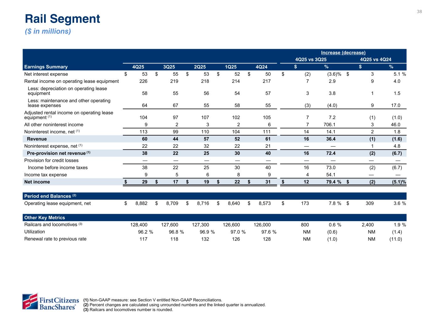 38 Increase (decrease) 4Q25 vs 3Q25 4Q25 vs 4Q24 Earnings Summary 4Q25 3Q25 2Q25 1Q25 4Q24 $ % $ % Net interest expense $ 53 $ 55 $ 53 $ 52 $ 50 $ (2) (3.6) % $ 3 5.1 % Rental income on operating lease equipment 226 219 218 214 217 7 2.9 9 4.0 Less: depreciation on operating lease equipment 58 55 56 54 57 3 3.8 1 1.5 Less: maintenance and other operating lease expenses 64 67 55 58 55 (3) (4.0) 9 17.0 Adjusted rental income on operating lease equipment (1) 104 97 107 102 105 7 7.2 (1) (1.0) All other noninterest income 9 2 3 2 6 7 706.1 3 46.0 Noninterest income, net (1) 113 99 110 104 111 14 14.1 2 1.8 Revenue 60 44 57 52 61 16 36.4 (1) (1.6) Noninterest expense, net (1) 22 22 32 22 21 — — 1 4.8 Pre-provision net revenue (1) 38 22 25 30 40 16 72.4 (2) (6.7) Provision for credit losses — — — — — — — — — Income before income taxes 38 22 25 30 40 16 73.0 (2) (6.7) Income tax expense 9 5 6 8 9 4 54.1 — — Net income $ 29 $ 17 $ 19 $ 22 $ 31 $ 12 79.4 % $ (2) (5.1) % Period end Balances (2) Operating lease equipment, net $ 8,882 $ 8,709 $ 8,716 $ 8,640 $ 8,573 $ 173 7.8 % $ 309 3.6 % Other Key Metrics Railcars and locomotives (3) 128,400 127,600 127,300 126,600 126,000 800 0.6 % 2,400 1.9 % Utilization 96.2 % 96.8 % 96.9 % 97.0 % 97.6 % NM (0.6) NM (1.4) Renewal rate to previous rate 117 118 132 126 128 NM (1.0) NM (11.0) Rail Segment ($ in millions) (1) Non-GAAP measure: see Section V entitled Non-GAAP Reconciliations. (2) Percent changes are calculated using unrounded numbers and the linked quarter is annualized. (3) Railcars and locomotives number is rounded.