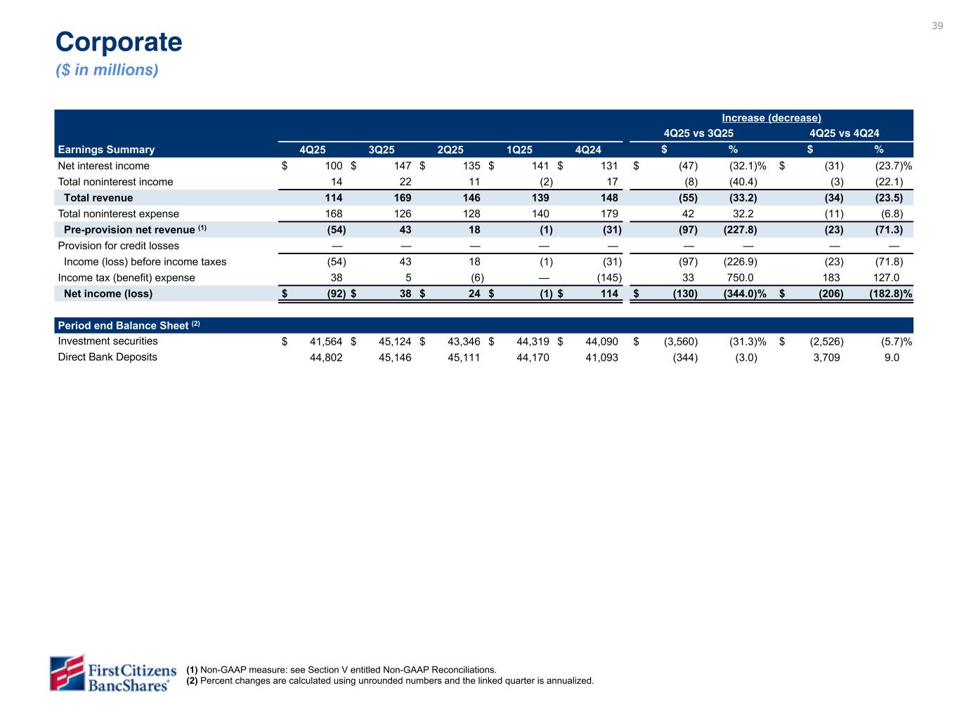 39 Corporate ($ in millions) (1) Non-GAAP measure: see Section V entitled Non-GAAP Reconciliations. (2) Percent changes are calculated using unrounded numbers and the linked quarter is annualized. Increase (decrease) 4Q25 vs 3Q25 4Q25 vs 4Q24 Earnings Summary 4Q25 3Q25 2Q25 1Q25 4Q24 $ % $ % Net interest income $ 100 $ 147 $ 135 $ 141 $ 131 $ (47) (32.1) % $ (31) (23.7) % Total noninterest income 14 22 11 (2) 17 (8) (40.4) (3) (22.1) Total revenue 114 169 146 139 148 (55) (33.2) (34) (23.5) Total noninterest expense 168 126 128 140 179 42 32.2 (11) (6.8) Pre-provision net revenue (1) (54) 43 18 (1) (31) (97) (227.8) (23) (71.3) Provision for credit losses — — — — — — — — — Income (loss) before income taxes (54) 43 18 (1) (31) (97) (226.9) (23) (71.8) Income tax (benefit) expense 38 5 (6) — (145) 33 750.0 183 127.0 Net income (loss) $ (92) $ 38 $ 24 $ (1) $ 114 $ (130) (344.0) % $ (206) (182.8) % Period end Balance Sheet (2) Investment securities $ 41,564 $ 45,124 $ 43,346 $ 44,319 $ 44,090 $ (3,560) (31.3) % $ (2,526) (5.7) % Direct Bank Deposits 44,802 45,146 45,111 44,170 41,093 (344) (3.0) 3,709 9.0