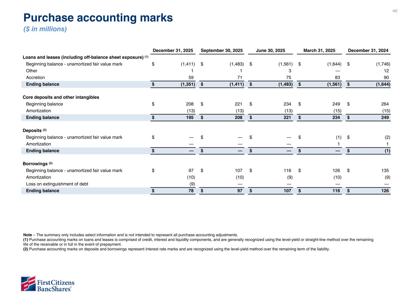 40 December 31, 2025 September 30, 2025 June 30, 2025 March 31, 2025 December 31, 2024 Loans and leases (including off-balance sheet exposure) (1) Beginning balance - unamortized fair value mark $ (1,411) $ (1,483) $ (1,561) $ (1,644) $ (1,746) Other 1 1 3 — 12 Accretion 59 71 75 83 90 Ending balance $ (1,351) $ (1,411) $ (1,483) $ (1,561) $ (1,644) Core deposits and other intangibles Beginning balance $ 208 $ 221 $ 234 $ 249 $ 264 Amortization (13) (13) (13) (15) (15) Ending balance $ 195 $ 208 $ 221 $ 234 $ 249 Deposits (2) Beginning balance - unamortized fair value mark $ — $ — $ — $ (1) $ (2) Amortization — — — 1 1 Ending balance $ — $ — $ — $ — $ (1) Borrowings (2) Beginning balance - unamortized fair value mark $ 97 $ 107 $ 116 $ 126 $ 135 Amortization (10) (10) (9) (10) (9) Loss on extinguishment of debt (9) — — — — Ending balance $ 78 $ 97 $ 107 $ 116 $ 126 Purchase accounting marks ($ in millions) Note – The summary only includes select information and is not intended to represent all purchase accounting adjustments. (1) Purchase accounting marks on loans and leases is comprised of credit, interest and liquidity components, and are generally recognized using the level-yield or straight-line method over the remaining life of the receivable or in full in the event of prepayment. (2) Purchase accounting marks on deposits and borrowings represent interest rate marks and are recognized using the level-yield method over the remaining term of the liability.