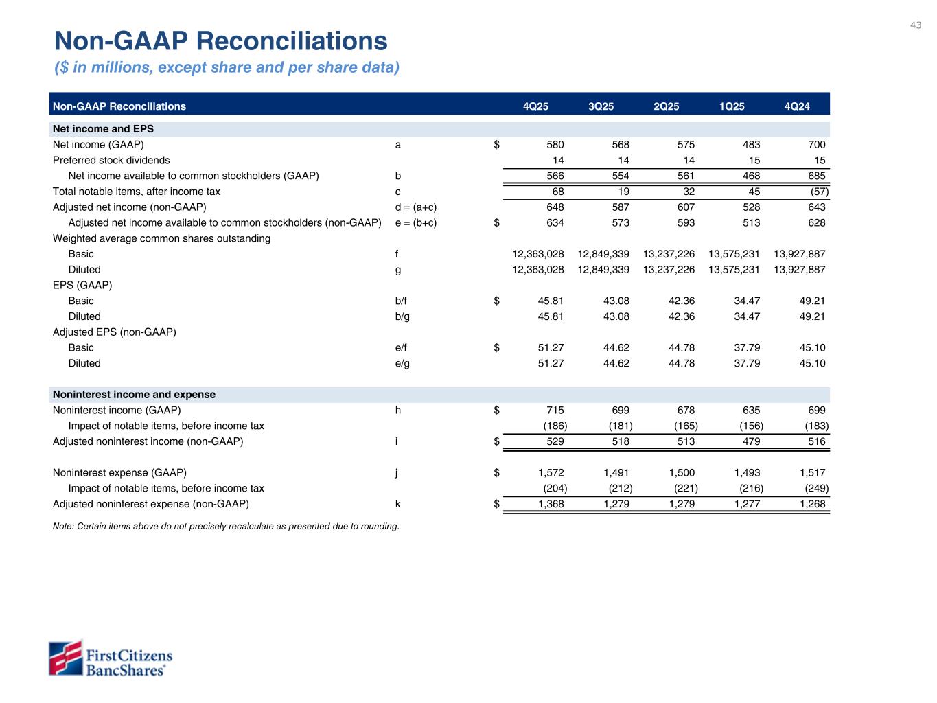 43 Non-GAAP Reconciliations 4Q25 3Q25 2Q25 1Q25 4Q24 Net income and EPS Net income (GAAP) a $ 580 568 575 483 700 Preferred stock dividends 14 14 14 15 15 Net income available to common stockholders (GAAP) b 566 554 561 468 685 Total notable items, after income tax c 68 19 32 45 (57) Adjusted net income (non-GAAP) d = (a+c) 648 587 607 528 643 Adjusted net income available to common stockholders (non-GAAP) e = (b+c) $ 634 573 593 513 628 Weighted average common shares outstanding Basic f 12,363,028 12,849,339 13,237,226 13,575,231 13,927,887 Diluted g 12,363,028 12,849,339 13,237,226 13,575,231 13,927,887 EPS (GAAP) Basic b/f $ 45.81 43.08 42.36 34.47 49.21 Diluted b/g 45.81 43.08 42.36 34.47 49.21 Adjusted EPS (non-GAAP) Basic e/f $ 51.27 44.62 44.78 37.79 45.10 Diluted e/g 51.27 44.62 44.78 37.79 45.10 Noninterest income and expense Noninterest income (GAAP) h $ 715 699 678 635 699 Impact of notable items, before income tax (186) (181) (165) (156) (183) Adjusted noninterest income (non-GAAP) i $ 529 518 513 479 516 Noninterest expense (GAAP) j $ 1,572 1,491 1,500 1,493 1,517 Impact of notable items, before income tax (204) (212) (221) (216) (249) Adjusted noninterest expense (non-GAAP) k $ 1,368 1,279 1,279 1,277 1,268 Note: Certain items above do not precisely recalculate as presented due to rounding. Non-GAAP Reconciliations ($ in millions, except share and per share data)