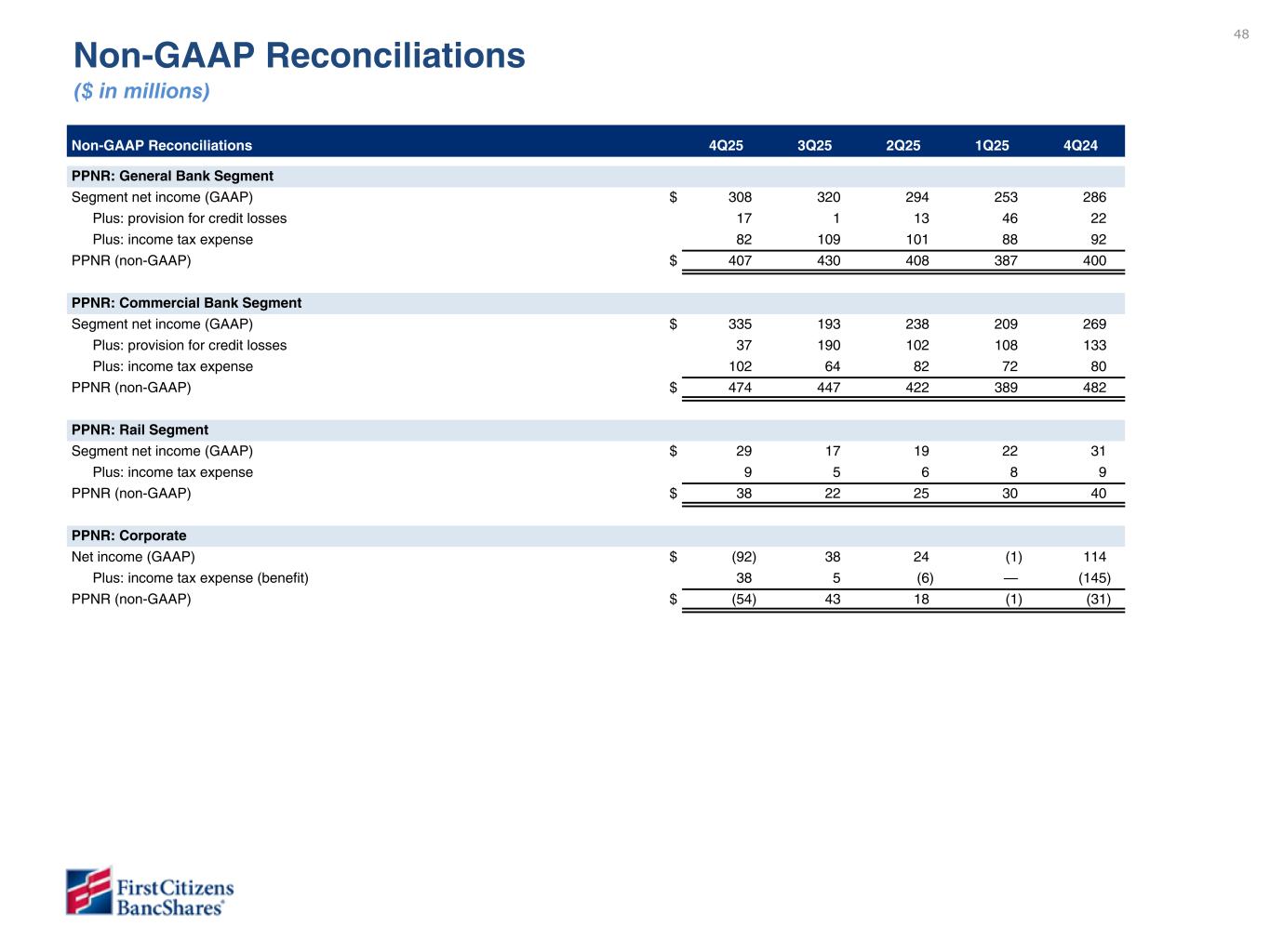 47 Non-GAAP Reconciliations ($ in millions, except share and per share data) Non-GAAP Reconciliations 4Q25 3Q25 2Q25 1Q25 4Q24 Noninterest Income and Noninterest Expense: Commercial Bank Segment Noninterest income (GAAP) $ 296 290 282 257 293 Less: depreciation on operating lease equipment 44 43 44 44 44 Noninterest income, net (non-GAAP) $ 252 247 238 213 249 Noninterest expense (GAAP) $ 656 639 649 654 662 Less: depreciation on operating lease equipment 44 43 44 44 44 Noninterest expense, net (non-GAAP) $ 612 596 605 610 618 Noninterest Income and Noninterest Expense: Rail Segment Noninterest income (GAAP) $ 235 221 221 216 223 Less: depreciation on operating lease equipment 58 55 56 54 57 Less: maintenance and other operating lease expenses 64 67 55 58 55 Noninterest income, net (non-GAAP) $ 113 99 110 104 111 Noninterest expense (GAAP) $ 144 144 143 134 133 Less: depreciation on operating lease equipment 58 55 56 54 57 Less: maintenance and other operating lease expenses 64 67 55 58 55 Noninterest expense, net (non-GAAP) $ 22 22 32 22 21 Note: Certain items above do not precisely recalculate as presented due to rounding.