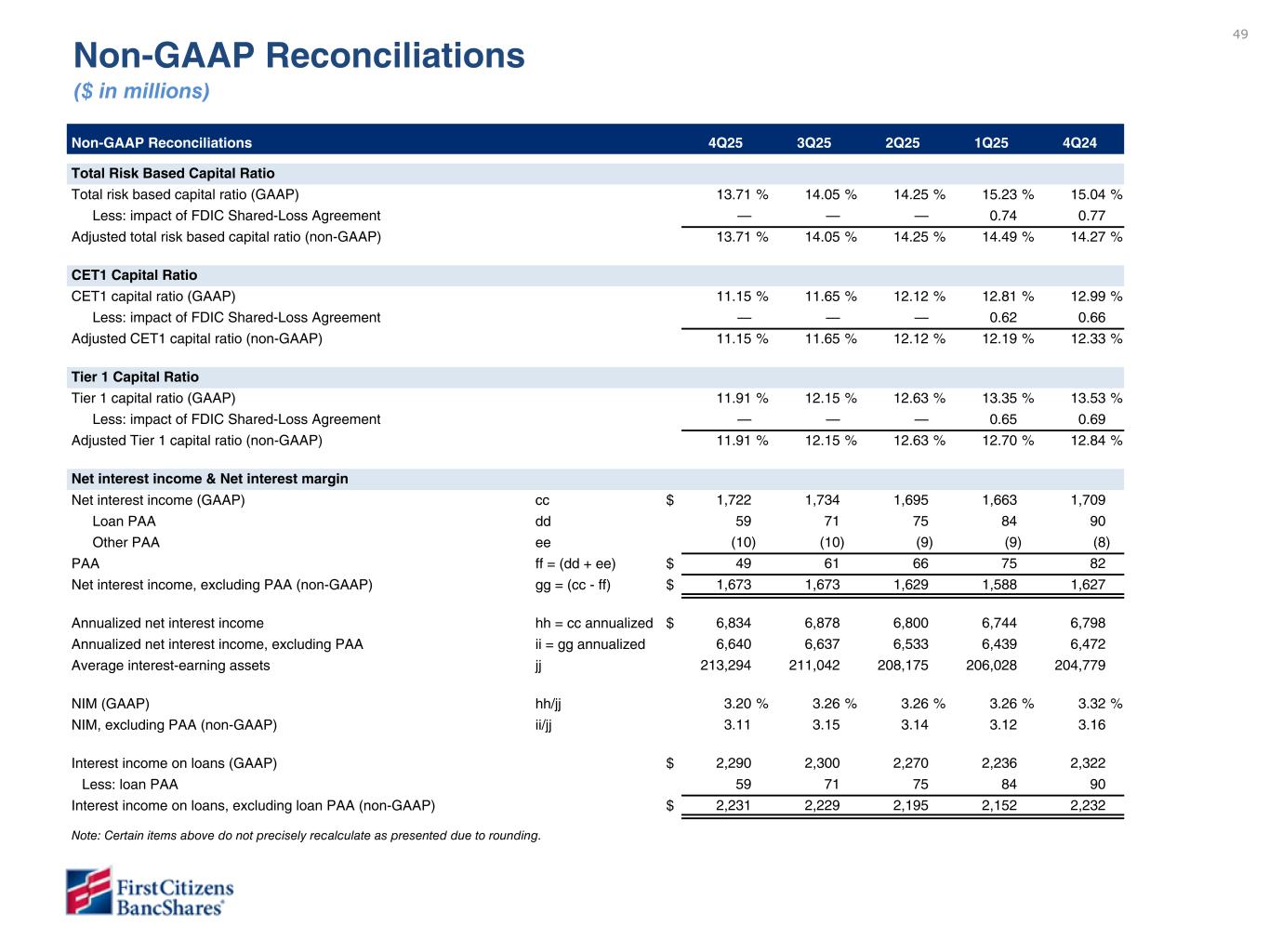 49 Non-GAAP Reconciliations ($ in millions) Non-GAAP Reconciliations 4Q25 3Q25 2Q25 1Q25 4Q24 Total Risk Based Capital Ratio Total risk based capital ratio (GAAP) 13.71 % 14.05 % 14.25 % 15.23 % 15.04 % Less: impact of FDIC Shared-Loss Agreement — — — 0.74 0.77 Adjusted total risk based capital ratio (non-GAAP) 13.71 % 14.05 % 14.25 % 14.49 % 14.27 % CET1 Capital Ratio CET1 capital ratio (GAAP) 11.15 % 11.65 % 12.12 % 12.81 % 12.99 % Less: impact of FDIC Shared-Loss Agreement — — — 0.62 0.66 Adjusted CET1 capital ratio (non-GAAP) 11.15 % 11.65 % 12.12 % 12.19 % 12.33 % Tier 1 Capital Ratio Tier 1 capital ratio (GAAP) 11.91 % 12.15 % 12.63 % 13.35 % 13.53 % Less: impact of FDIC Shared-Loss Agreement — — — 0.65 0.69 Adjusted Tier 1 capital ratio (non-GAAP) 11.91 % 12.15 % 12.63 % 12.70 % 12.84 % Net interest income & Net interest margin Net interest income (GAAP) cc $ 1,722 1,734 1,695 1,663 1,709 Loan PAA dd 59 71 75 84 90 Other PAA ee (10) (10) (9) (9) (8) PAA ff = (dd + ee) $ 49 61 66 75 82 Net interest income, excluding PAA (non-GAAP) gg = (cc - ff) $ 1,673 1,673 1,629 1,588 1,627 Annualized net interest income hh = cc annualized $ 6,834 6,878 6,800 6,744 6,798 Annualized net interest income, excluding PAA ii = gg annualized 6,640 6,637 6,533 6,439 6,472 Average interest-earning assets jj 213,294 211,042 208,175 206,028 204,779 NIM (GAAP) hh/jj 3.20 % 3.26 % 3.26 % 3.26 % 3.32 % NIM, excluding PAA (non-GAAP) ii/jj 3.11 3.15 3.14 3.12 3.16 Interest income on loans (GAAP) $ 2,290 2,300 2,270 2,236 2,322 Less: loan PAA 59 71 75 84 90 Interest income on loans, excluding loan PAA (non-GAAP) $ 2,231 2,229 2,195 2,152 2,232 Note: Certain items above do not precisely recalculate as presented due to rounding.