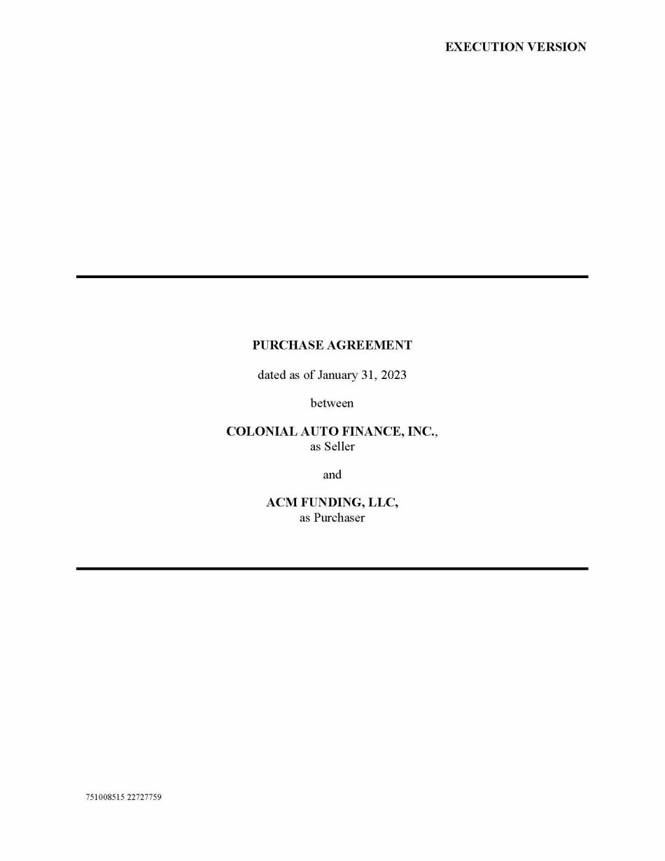EXECUTION VERSION 751008515 22727759 PURCHASE AGREEMENT dated as of January 31, 2023 between COLONIAL AUTO FINANCE, INC. , as Seller and ACM FUNDING, LLC, as Purchaser