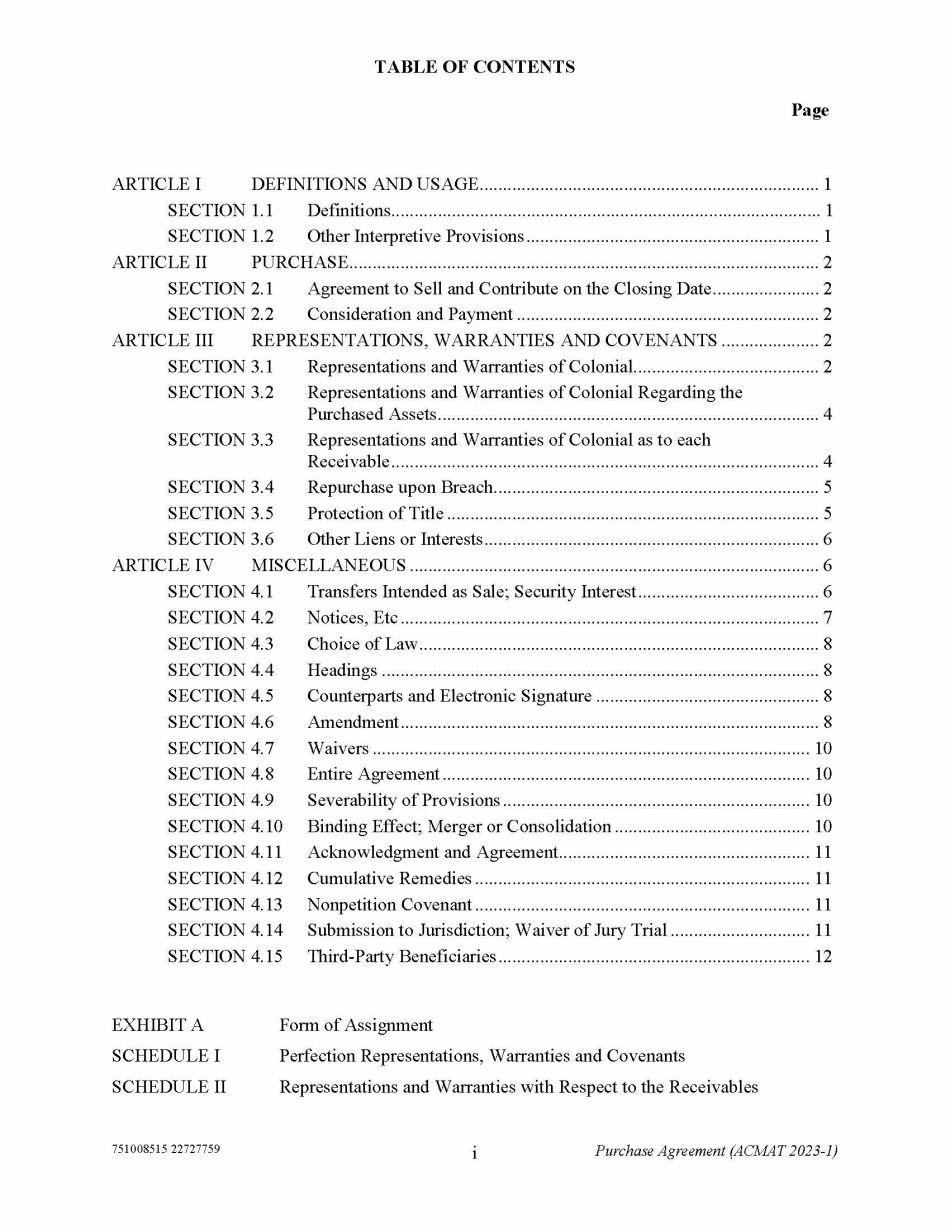 TABLE OF CONTENTS Page ARTICLE I DEFINITIONS AND USAGE......................................................................... 1 751008515 22727759 i Purchase Agreement (ACMAT 2023 - 1) SECTION 1.1 SECTION 1.2 Definitions............................................................................................ 1 Other Interpretive Provisions ............................................................... 1 ARTICLE II PURCHASE..................................................................................................... 2 SECTION 2.1 SECTION 2.2 Agreement to Sell and Contribute on the Closing Date....................... 2 Consideration and Payment ................................................................. 2 ARTICLE III REPRESENTATIONS, WARRANTIES AND COVENANTS ..................... 2 SECTION 3.1 SECTION 3.2 Representations and Warranties of Colonial........................................ 2 Representations and Warranties of Colonial Regarding the Purchased Assets.................................................................................. 4 Representations and Warranties of Colonial as to each Receivable ............................................................................................ 4 Repurchase upon Breach...................................................................... 5 Protection of Title ................................................................................ 5 Other Liens or Interests........................................................................ 6 SECTION 3.3 SECTION 3.4 SECTION 3.5 SECTION 3.6 ARTICLE IV MISCELLANEOUS ........................................................................................ 6 SECTION 4.1 SECTION 4.2 SECTION 4.3 SECTION 4.4 SECTION 4.5 SECTION 4.6 SECTION 4.7 SECTION 4.8 SECTION 4.9 SECTION 4.10 SECTION 4.11 SECTION 4.12 SECTION 4.13 SECTION 4.14 SECTION 4.15 Transfers Intended as Sale; Security Interest....................................... 6 Notices, Etc .......................................................................................... 7 Choice of Law ...................................................................................... 8 Headings .............................................................................................. 8 Counterparts and Electronic Signature ................................................ 8 Amendment.......................................................................................... 8 Waivers .............................................................................................. 10 Entire Agreement ............................................................................... 10 Severability of Provisions .................................................................. 10 Binding Effect; Merger or Consolidation .......................................... 10 Acknowledgment and Agreement...................................................... 11 Cumulative Remedies ........................................................................ 11 Nonpetition Covenant ........................................................................ 11 Submission to Jurisdiction; Waiver of Jury Trial .............................. 11 Third - Party Beneficiaries ................................................................... 12 EXHIBIT A SCHEDULE I SCHEDULE II Form of Assignment Perfection Representations, Warranties and Covenants Representations and Warranties with Respect to the Receivables