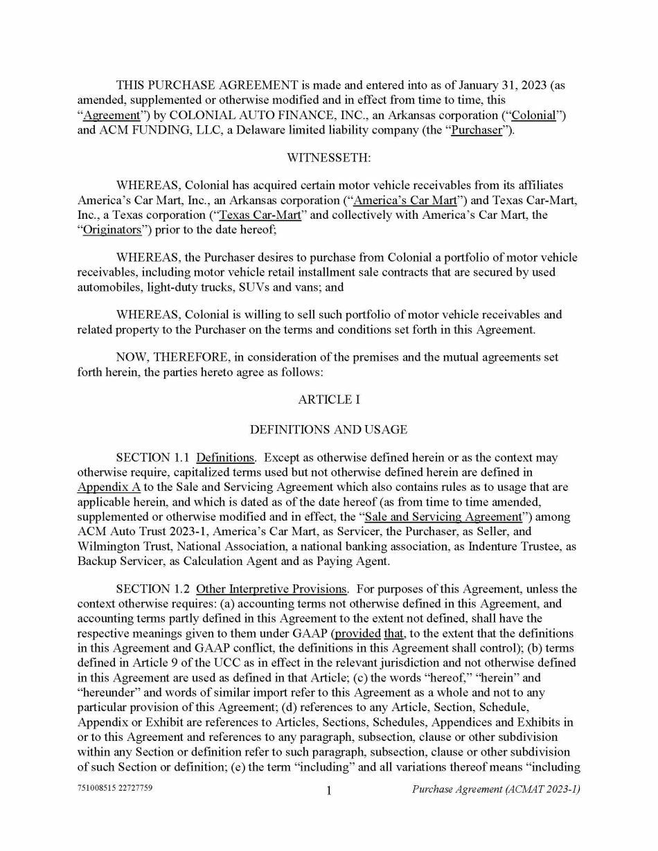 751008515 22727759 1 Purchase Agreement (ACMAT 2023 - 1) THIS PURCHASE AGREEMENT is made and entered into as of January 31, 2023 (as amended, supplemented or otherwise modified and in effect from time to time, this “ Agreement ”) by COLONIAL AUTO FINANCE, INC., an Arkansas corporation (“ Colonial ”) and ACM FUNDING, LLC, a Delaware limited liability company (the “ Purchaser ”). WITNESSETH: WHEREAS, Colonial has acquired certain motor vehicle receivables from its affiliates America’s Car Mart, Inc., an Arkansas corporation (“ America’s Car Mart ”) and Texas Car - Mart, Inc., a Texas corporation (“ Texas Car - Mart ” and collectively with America’s Car Mart, the “ Originators ”) prior to the date hereof; WHEREAS, the Purchaser desires to purchase from Colonial a portfolio of motor vehicle receivables, including motor vehicle retail installment sale contracts that are secured by used automobiles, light - duty trucks, SUVs and vans; and WHEREAS, Colonial is willing to sell such portfolio of motor vehicle receivables and related property to the Purchaser on the terms and conditions set forth in this Agreement. NOW, THEREFORE, in consideration of the premises and the mutual agreements set forth herein, the parties hereto agree as follows: ARTICLE I DEFINITIONS AND USAGE SECTION 1.1 Definitions . Except as otherwise defined herein or as the context may otherwise require, capitalized terms used but not otherwise defined herein are defined in Appendix A to the Sale and Servicing Agreement which also contains rules as to usage that are applicable herein, and which is dated as of the date hereof (as from time to time amended, supplemented or otherwise modified and in effect, the “ Sale and Servicing Agreement ”) among ACM Auto Trust 2023 - 1, America’s Car Mart, as Servicer, the Purchaser, as Seller, and Wilmington Trust, National Association, a national banking association, as Indenture Trustee, as Backup Servicer, as Calculation Agent and as Paying Agent. SECTION 1.2 Other Interpretive Provisions . For purposes of this Agreement, unless the context otherwise requires: (a) accounting terms not otherwise defined in this Agreement, and accounting terms partly defined in this Agreement to the extent not defined, shall have the respective meanings given to them under GAAP ( provided that , to the extent that the definitions in this Agreement and GAAP conflict, the definitions in this Agreement shall control); (b) terms defined in Article 9 of the UCC as in effect in the relevant jurisdiction and not otherwise defined in this Agreement are used as defined in that Article; (c) the words “hereof,” “herein” and “hereunder” and words of similar import refer to this Agreement as a whole and not to any particular provision of this Agreement; (d) references to any Article, Section, Schedule, Appendix or Exhibit are references to Articles, Sections, Schedules, Appendices and Exhibits in or to this Agreement and references to any paragraph, subsection, clause or other subdivision within any Section or definition refer to such paragraph, subsection, clause or other subdivision of such Section or definition; (e) the term “including” and all variations thereof means “including