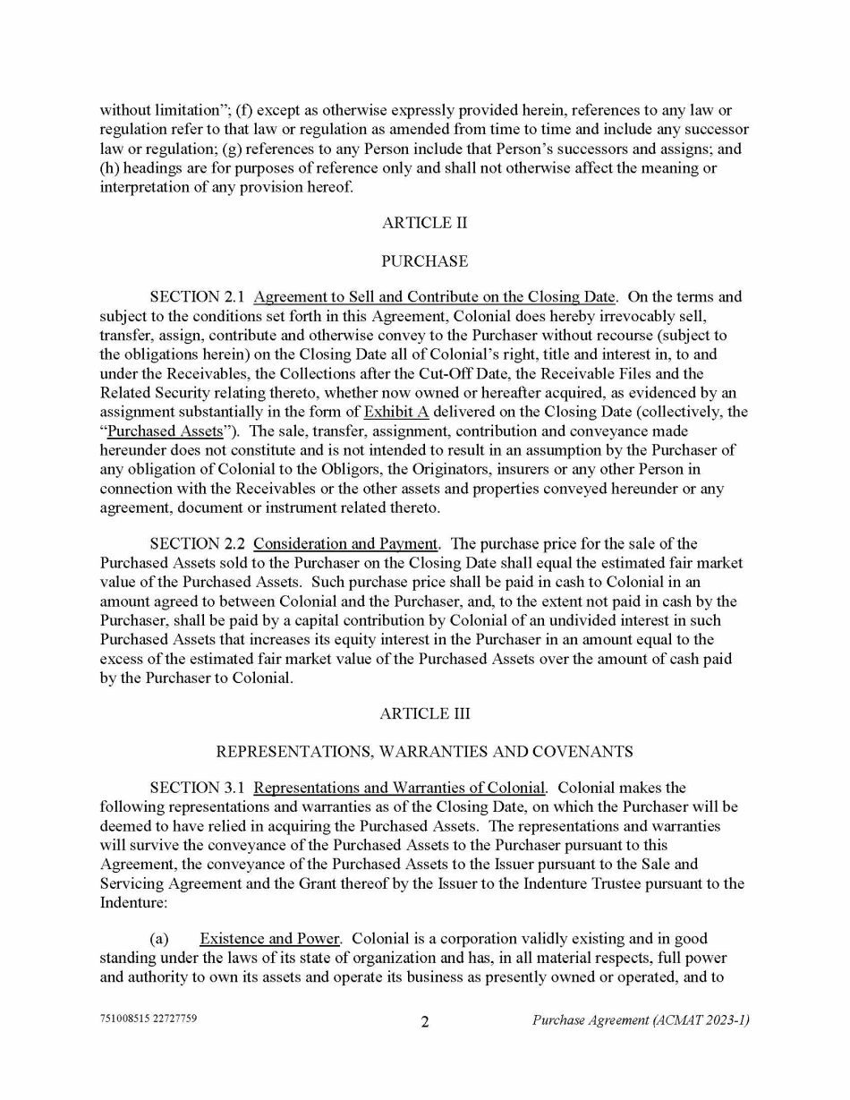 751008515 22727759 2 Purchase Agreement (ACMAT 2023 - 1) without limitation”; (f) except as otherwise expressly provided herein, references to any law or regulation refer to that law or regulation as amended from time to time and include any successor law or regulation; (g) references to any Person include that Person’s successors and assigns; and (h) headings are for purposes of reference only and shall not otherwise affect the meaning or interpretation of any provision hereof. ARTICLE II PURCHASE SECTION 2.1 Agreement to Sell and Contribute on the Closing Date . On the terms and subject to the conditions set forth in this Agreement, Colonial does hereby irrevocably sell, transfer, assign, contribute and otherwise convey to the Purchaser without recourse (subject to the obligations herein) on the Closing Date all of Colonial’s right, title and interest in, to and under the Receivables, the Collections after the Cut - Off Date, the Receivable Files and the Related Security relating thereto, whether now owned or hereafter acquired, as evidenced by an assignment substantially in the form of Exhibit A delivered on the Closing Date (collectively, the “ Purchased Assets ”). The sale, transfer, assignment, contribution and conveyance made hereunder does not constitute and is not intended to result in an assumption by the Purchaser of any obligation of Colonial to the Obligors, the Originators, insurers or any other Person in connection with the Receivables or the other assets and properties conveyed hereunder or any agreement, document or instrument related thereto. SECTION 2.2 Consideration and Payment . The purchase price for the sale of the Purchased Assets sold to the Purchaser on the Closing Date shall equal the estimated fair market value of the Purchased Assets. Such purchase price shall be paid in cash to Colonial in an amount agreed to between Colonial and the Purchaser, and, to the extent not paid in cash by the Purchaser, shall be paid by a capital contribution by Colonial of an undivided interest in such Purchased Assets that increases its equity interest in the Purchaser in an amount equal to the excess of the estimated fair market value of the Purchased Assets over the amount of cash paid by the Purchaser to Colonial. ARTICLE III REPRESENTATIONS, WARRANTIES AND COVENANTS SECTION 3.1 Representations and Warranties of Colonial . Colonial makes the following representations and warranties as of the Closing Date, on which the Purchaser will be deemed to have relied in acquiring the Purchased Assets. The representations and warranties will survive the conveyance of the Purchased Assets to the Purchaser pursuant to this Agreement, the conveyance of the Purchased Assets to the Issuer pursuant to the Sale and Servicing Agreement and the Grant thereof by the Issuer to the Indenture Trustee pursuant to the Indenture: (a) Existence and Power . Colonial is a corporation validly existing and in good standing under the laws of its state of organization and has, in all material respects, full power and authority to own its assets and operate its business as presently owned or operated, and to