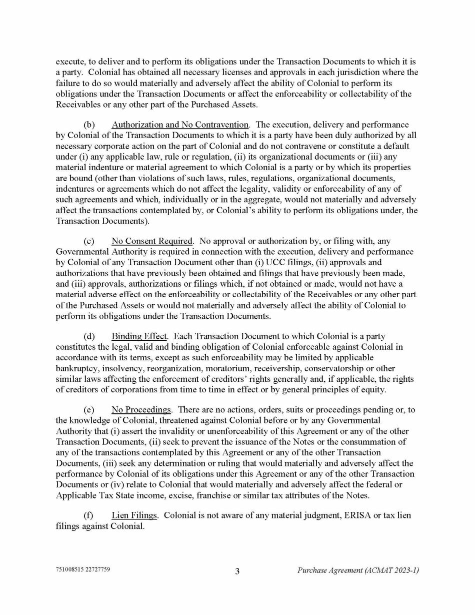751008515 22727759 3 Purchase Agreement (ACMAT 2023 - 1) execute, to deliver and to perform its obligations under the Transaction Documents to which it is a party. Colonial has obtained all necessary licenses and approvals in each jurisdiction where the failure to do so would materially and adversely affect the ability of Colonial to perform its obligations under the Transaction Documents or affect the enforceability or collectability of the Receivables or any other part of the Purchased Assets. (b) Authorization and No Contravention . The execution, delivery and performance by Colonial of the Transaction Documents to which it is a party have been duly authorized by all necessary corporate action on the part of Colonial and do not contravene or constitute a default under (i) any applicable law, rule or regulation, (ii) its organizational documents or (iii) any material indenture or material agreement to which Colonial is a party or by which its properties are bound (other than violations of such laws, rules, regulations, organizational documents, indentures or agreements which do not affect the legality, validity or enforceability of any of such agreements and which, individually or in the aggregate, would not materially and adversely affect the transactions contemplated by, or Colonial’s ability to perform its obligations under, the Transaction Documents). (c) No Consent Required . No approval or authorization by, or filing with, any Governmental Authority is required in connection with the execution, delivery and performance by Colonial of any Transaction Document other than (i) UCC filings, (ii) approvals and authorizations that have previously been obtained and filings that have previously been made, and (iii) approvals, authorizations or filings which, if not obtained or made, would not have a material adverse effect on the enforceability or collectability of the Receivables or any other part of the Purchased Assets or would not materially and adversely affect the ability of Colonial to perform its obligations under the Transaction Documents. (d) Binding Effect . Each Transaction Document to which Colonial is a party constitutes the legal, valid and binding obligation of Colonial enforceable against Colonial in accordance with its terms, except as such enforceability may be limited by applicable bankruptcy, insolvency, reorganization, moratorium, receivership, conservatorship or other similar laws affecting the enforcement of creditors’ rights generally and, if applicable, the rights of creditors of corporations from time to time in effect or by general principles of equity. (e) No Proceedings . There are no actions, orders, suits or proceedings pending or, to the knowledge of Colonial, threatened against Colonial before or by any Governmental Authority that (i) assert the invalidity or unenforceability of this Agreement or any of the other Transaction Documents, (ii) seek to prevent the issuance of the Notes or the consummation of any of the transactions contemplated by this Agreement or any of the other Transaction Documents, (iii) seek any determination or ruling that would materially and adversely affect the performance by Colonial of its obligations under this Agreement or any of the other Transaction Documents or (iv) relate to Colonial that would materially and adversely affect the federal or Applicable Tax State income, excise, franchise or similar tax attributes of the Notes. (f) Lien Filings . Colonial is not aware of any material judgment, ERISA or tax lien filings against Colonial.