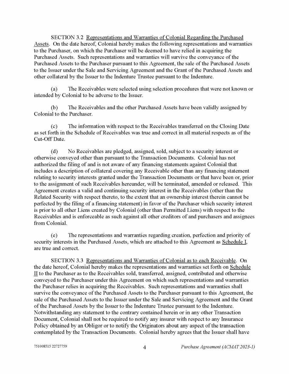 751008515 22727759 4 Purchase Agreement (ACMAT 2023 - 1) SECTION 3.2 Representations and Warranties of Colonial Regarding the Purchased Assets . On the date hereof, Colonial hereby makes the following representations and warranties to the Purchaser, on which the Purchaser will be deemed to have relied in acquiring the Purchased Assets. Such representations and warranties will survive the conveyance of the Purchased Assets to the Purchaser pursuant to this Agreement, the sale of the Purchased Assets to the Issuer under the Sale and Servicing Agreement and the Grant of the Purchased Assets and other collateral by the Issuer to the Indenture Trustee pursuant to the Indenture. (a) The Receivables were selected using selection procedures that were not known or intended by Colonial to be adverse to the Issuer. (b) The Receivables and the other Purchased Assets have been validly assigned by Colonial to the Purchaser. (c) The information with respect to the Receivables transferred on the Closing Date as set forth in the Schedule of Receivables was true and correct in all material respects as of the Cut - Off Date . (d) No Receivables are pledged, assigned, sold, subject to a security interest or otherwise conveyed other than pursuant to the Transaction Documents. Colonial has not authorized the filing of and is not aware of any financing statements against Colonial that includes a description of collateral covering any Receivable other than any financing statement relating to security interests granted under the Transaction Documents or that have been or, prior to the assignment of such Receivables hereunder, will be terminated, amended or released. This Agreement creates a valid and continuing security interest in the Receivables (other than the Related Security with respect thereto, to the extent that an ownership interest therein cannot be perfected by the filing of a financing statement) in favor of the Purchaser which security interest is prior to all other Liens created by Colonial (other than Permitted Liens) with respect to the Receivables and is enforceable as such against all other creditors of and purchasers and assignees from Colonial. (e) The representations and warranties regarding creation, perfection and priority of security interests in the Purchased Assets, which are attached to this Agreement as Schedule I , are true and correct. SECTION 3.3 Representations and Warranties of Colonial as to each Receivable . On the date hereof, Colonial hereby makes the representations and warranties set forth on Schedule II to the Purchaser as to the Receivables sold, transferred, assigned, contributed and otherwise conveyed to the Purchaser under this Agreement on which such representations and warranties the Purchaser relies in acquiring the Receivables. Such representations and warranties shall survive the conveyance of the Purchased Assets to the Purchaser pursuant to this Agreement, the sale of the Purchased Assets to the Issuer under the Sale and Servicing Agreement and the Grant of the Purchased Assets by the Issuer to the Indenture Trustee pursuant to the Indenture. Notwithstanding any statement to the contrary contained herein or in any other Transaction Document, Colonial shall not be required to notify any insurer with respect to any Insurance Policy obtained by an Obligor or to notify the Originators about any aspect of the transaction contemplated by the Transaction Documents. Colonial hereby agrees that the Issuer shall have