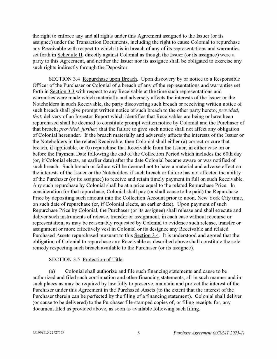 751008515 22727759 5 Purchase Agreement (ACMAT 2023 - 1) the right to enforce any and all rights under this Agreement assigned to the Issuer (or its assignee) under the Transaction Documents, including the right to cause Colonial to repurchase any Receivable with respect to which it is in breach of any of its representations and warranties set forth in Schedule II , directly against Colonial as though the Issuer (or its assignee) were a party to this Agreement, and neither the Issuer nor its assignee shall be obligated to exercise any such rights indirectly through the Depositor. SECTION 3.4 Repurchase upon Breach . Upon discovery by or notice to a Responsible Officer of the Purchaser or Colonial of a breach of any of the representations and warranties set forth in Section 3.3 with respect to any Receivable at the time such representations and warranties were made which materially and adversely affects the interests of the Issuer or the Noteholders in such Receivable, the party discovering such breach or receiving written notice of such breach shall give prompt written notice of such breach to the other party hereto; provided , that , delivery of an Investor Report which identifies that Receivables are being or have been repurchased shall be deemed to constitute prompt written notice by Colonial and the Purchaser of that breach; provided, further, that the failure to give such notice shall not affect any obligation of Colonial hereunder. If the breach materially and adversely affects the interests of the Issuer or the Noteholders in the related Receivable, then Colonial shall either (a) correct or cure that breach, if applicable, or (b) repurchase that Receivable from the Issuer, in either case on or before the Payment Date following the end of the Collection Period which includes the 60th day (or, if Colonial elects, an earlier date) after the date Colonial became aware or was notified of such breach. Such breach or failure will be deemed not to have a material and adverse effect on the interests of the Issuer or the Noteholders if such breach or failure has not affected the ability of the Purchaser (or its assignee) to receive and retain timely payment in full on such Receivable. Any such repurchase by Colonial shall be at a price equal to the related Repurchase Price. In consideration for that repurchase, Colonial shall pay (or shall cause to be paid) the Repurchase Price by depositing such amount into the Collection Account prior to noon, New York City time, on such date of repurchase (or, if Colonial elects, an earlier date). Upon payment of such Repurchase Price by Colonial, the Purchaser (or its assignee) shall release and shall execute and deliver such instruments of release, transfer or assignment, in each case without recourse or representation, as may be reasonably requested by Colonial to evidence such release, transfer or assignment or more effectively vest in Colonial or its designee any Receivable and related Purchased Assets repurchased pursuant to this Section 3.4 . It is understood and agreed that the obligation of Colonial to repurchase any Receivable as described above shall constitute the sole remedy respecting such breach available to the Purchaser (or its assignee). SECTION 3.5 Protection of Title . (a) Colonial shall authorize and file such financing statements and cause to be authorized and filed such continuation and other financing statements, all in such manner and in such places as may be required by law fully to preserve, maintain and protect the interest of the Purchaser under this Agreement in the Purchased Assets (to the extent that the interest of the Purchaser therein can be perfected by the filing of a financing statement). Colonial shall deliver (or cause to be delivered) to the Purchaser file - stamped copies of, or filing receipts for, any document filed as provided above, as soon as available following such filing.