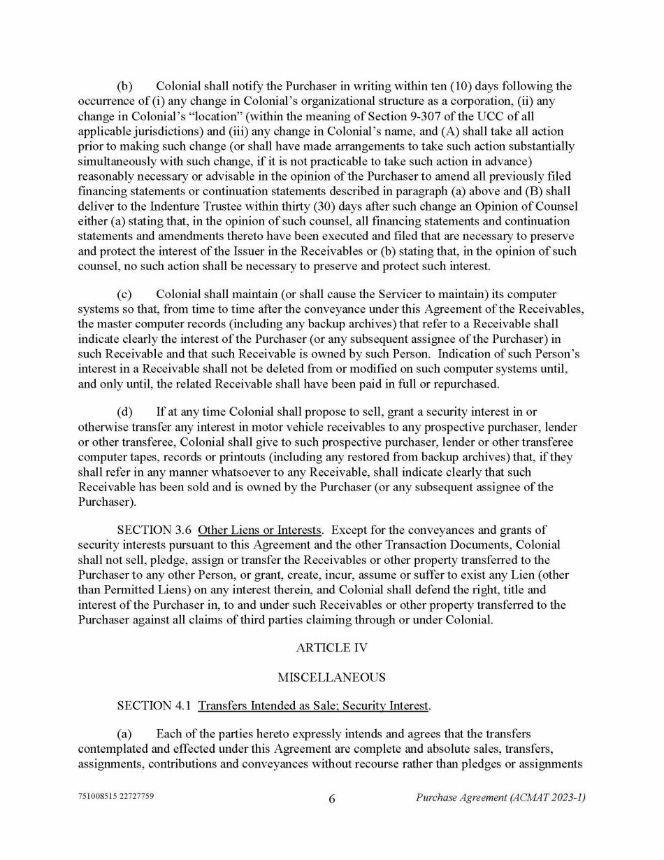 751008515 22727759 6 Purchase Agreement (ACMAT 2023 - 1) (b) Colonial shall notify the Purchaser in writing within ten (10) days following the occurrence of (i) any change in Colonial’s organizational structure as a corporation, (ii) any change in Colonial’s “location” (within the meaning of Section 9 - 307 of the UCC of all applicable jurisdictions) and (iii) any change in Colonial’s name, and (A) shall take all action prior to making such change (or shall have made arrangements to take such action substantially simultaneously with such change, if it is not practicable to take such action in advance) reasonably necessary or advisable in the opinion of the Purchaser to amend all previously filed financing statements or continuation statements described in paragraph (a) above and (B) shall deliver to the Indenture Trustee within thirty (30) days after such change an Opinion of Counsel either (a) stating that, in the opinion of such counsel, all financing statements and continuation statements and amendments thereto have been executed and filed that are necessary to preserve and protect the interest of the Issuer in the Receivables or (b) stating that, in the opinion of such counsel, no such action shall be necessary to preserve and protect such interest. (c) Colonial shall maintain (or shall cause the Servicer to maintain) its computer systems so that, from time to time after the conveyance under this Agreement of the Receivables, the master computer records (including any backup archives) that refer to a Receivable shall indicate clearly the interest of the Purchaser (or any subsequent assignee of the Purchaser) in such Receivable and that such Receivable is owned by such Person. Indication of such Person’s interest in a Receivable shall not be deleted from or modified on such computer systems until, and only until, the related Receivable shall have been paid in full or repurchased. (d) If at any time Colonial shall propose to sell, grant a security interest in or otherwise transfer any interest in motor vehicle receivables to any prospective purchaser, lender or other transferee, Colonial shall give to such prospective purchaser, lender or other transferee computer tapes, records or printouts (including any restored from backup archives) that, if they shall refer in any manner whatsoever to any Receivable, shall indicate clearly that such Receivable has been sold and is owned by the Purchaser (or any subsequent assignee of the Purchaser). SECTION 3.6 Other Liens or Interests . Except for the conveyances and grants of security interests pursuant to this Agreement and the other Transaction Documents, Colonial shall not sell, pledge, assign or transfer the Receivables or other property transferred to the Purchaser to any other Person, or grant, create, incur, assume or suffer to exist any Lien (other than Permitted Liens) on any interest therein, and Colonial shall defend the right, title and interest of the Purchaser in, to and under such Receivables or other property transferred to the Purchaser against all claims of third parties claiming through or under Colonial. ARTICLE IV MISCELLANEOUS SECTION 4.1 Transfers Intended as Sale; Security Interest . (a) Each of the parties hereto expressly intends and agrees that the transfers contemplated and effected under this Agreement are complete and absolute sales, transfers, assignments, contributions and conveyances without recourse rather than pledges or assignments