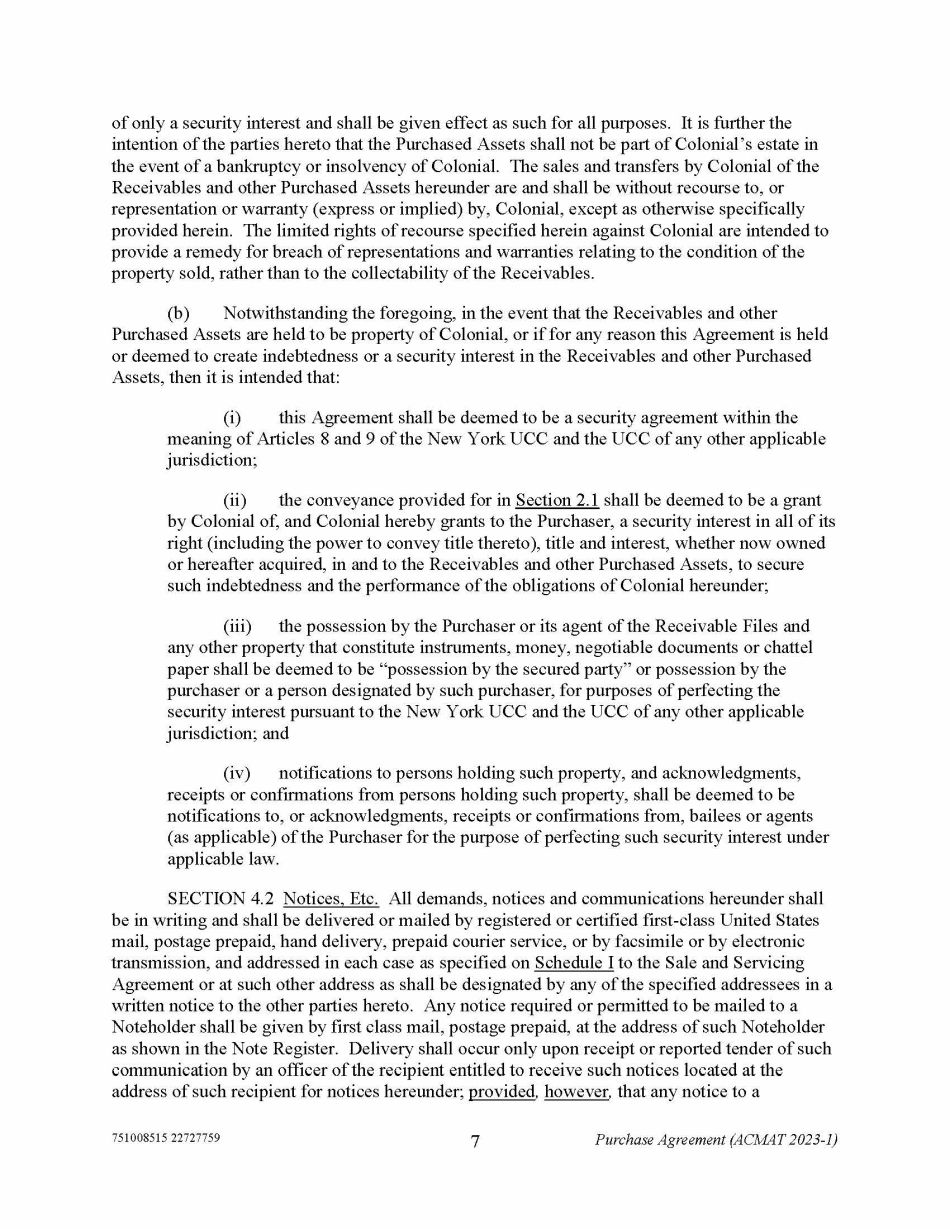 751008515 22727759 7 Purchase Agreement (ACMAT 2023 - 1) of only a security interest and shall be given effect as such for all purposes. It is further the intention of the parties hereto that the Purchased Assets shall not be part of Colonial’s estate in the event of a bankruptcy or insolvency of Colonial. The sales and transfers by Colonial of the Receivables and other Purchased Assets hereunder are and shall be without recourse to, or representation or warranty (express or implied) by, Colonial, except as otherwise specifically provided herein. The limited rights of recourse specified herein against Colonial are intended to provide a remedy for breach of representations and warranties relating to the condition of the property sold, rather than to the collectability of the Receivables. (b) Notwithstanding the foregoing, in the event that the Receivables and other Purchased Assets are held to be property of Colonial, or if for any reason this Agreement is held or deemed to create indebtedness or a security interest in the Receivables and other Purchased Assets, then it is intended that: (i) this Agreement shall be deemed to be a security agreement within the meaning of Articles 8 and 9 of the New York UCC and the UCC of any other applicable jurisdiction; (ii) the conveyance provided for in Section 2.1 shall be deemed to be a grant by Colonial of, and Colonial hereby grants to the Purchaser, a security interest in all of its right (including the power to convey title thereto), title and interest, whether now owned or hereafter acquired, in and to the Receivables and other Purchased Assets, to secure such indebtedness and the performance of the obligations of Colonial hereunder; (iii) the possession by the Purchaser or its agent of the Receivable Files and any other property that constitute instruments, money, negotiable documents or chattel paper shall be deemed to be “possession by the secured party” or possession by the purchaser or a person designated by such purchaser, for purposes of perfecting the security interest pursuant to the New York UCC and the UCC of any other applicable jurisdiction; and (iv) notifications to persons holding such property, and acknowledgments, receipts or confirmations from persons holding such property, shall be deemed to be notifications to, or acknowledgments, receipts or confirmations from, bailees or agents (as applicable) of the Purchaser for the purpose of perfecting such security interest under applicable law. SECTION 4.2 Notices, Etc. All demands, notices and communications hereunder shall be in writing and shall be delivered or mailed by registered or certified first - class United States mail, postage prepaid, hand delivery, prepaid courier service, or by facsimile or by electronic transmission, and addressed in each case as specified on Schedule I to the Sale and Servicing Agreement or at such other address as shall be designated by any of the specified addressees in a written notice to the other parties hereto. Any notice required or permitted to be mailed to a Noteholder shall be given by first class mail, postage prepaid, at the address of such Noteholder as shown in the Note Register. Delivery shall occur only upon receipt or reported tender of such communication by an officer of the recipient entitled to receive such notices located at the address of such recipient for notices hereunder; provided , however , that any notice to a