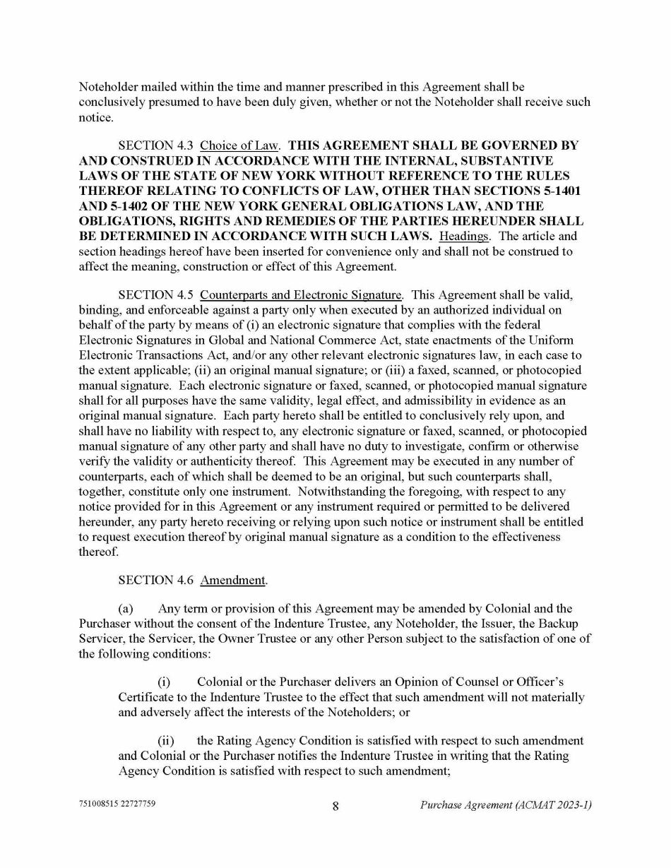 751008515 22727759 8 Purchase Agreement (ACMAT 2023 - 1) Noteholder mailed within the time and manner prescribed in this Agreement shall be conclusively presumed to have been duly given, whether or not the Noteholder shall receive such notice. SECTION 4.3 Choice of Law . THIS AGREEMENT SHALL BE GOVERNED BY AND CONSTRUED IN ACCORDANCE WITH THE INTERNAL, SUBSTANTIVE LAWS OF THE STATE OF NEW YORK WITHOUT REFERENCE TO THE RULES THEREOF RELATING TO CONFLICTS OF LAW, OTHER THAN SECTIONS 5 - 1401 AND 5 - 1402 OF THE NEW YORK GENERAL OBLIGATIONS LAW, AND THE OBLIGATIONS, RIGHTS AND REMEDIES OF THE PARTIES HEREUNDER SHALL BE DETERMINED IN ACCORDANCE WITH SUCH LAWS. Headings . The article and section headings hereof have been inserted for convenience only and shall not be construed to affect the meaning, construction or effect of this Agreement. SECTION 4.5 Counterparts and Electronic Signature . This Agreement shall be valid, binding, and enforceable against a party only when executed by an authorized individual on behalf of the party by means of (i) an electronic signature that complies with the federal Electronic Signatures in Global and National Commerce Act, state enactments of the Uniform Electronic Transactions Act, and/or any other relevant electronic signatures law, in each case to the extent applicable; (ii) an original manual signature; or (iii) a faxed, scanned, or photocopied manual signature. Each electronic signature or faxed, scanned, or photocopied manual signature shall for all purposes have the same validity, legal effect, and admissibility in evidence as an original manual signature. Each party hereto shall be entitled to conclusively rely upon, and shall have no liability with respect to, any electronic signature or faxed, scanned, or photocopied manual signature of any other party and shall have no duty to investigate, confirm or otherwise verify the validity or authenticity thereof. This Agreement may be executed in any number of counterparts, each of which shall be deemed to be an original, but such counterparts shall, together, constitute only one instrument. Notwithstanding the foregoing, with respect to any notice provided for in this Agreement or any instrument required or permitted to be delivered hereunder, any party hereto receiving or relying upon such notice or instrument shall be entitled to request execution thereof by original manual signature as a condition to the effectiveness thereof. SECTION 4.6 Amendment . (a) Any term or provision of this Agreement may be amended by Colonial and the Purchaser without the consent of the Indenture Trustee, any Noteholder, the Issuer, the Backup Servicer, the Servicer, the Owner Trustee or any other Person subject to the satisfaction of one of the following conditions: (i) Colonial or the Purchaser delivers an Opinion of Counsel or Officer’s Certificate to the Indenture Trustee to the effect that such amendment will not materially and adversely affect the interests of the Noteholders; or (ii) the Rating Agency Condition is satisfied with respect to such amendment and Colonial or the Purchaser notifies the Indenture Trustee in writing that the Rating Agency Condition is satisfied with respect to such amendment;
