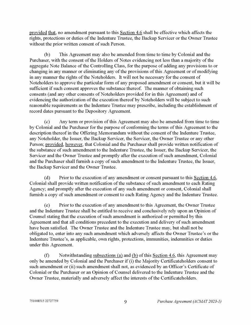 751008515 22727759 9 Purchase Agreement (ACMAT 2023 - 1) provided that , no amendment pursuant to this Section 4.6 shall be effective which affects the rights, protections or duties of the Indenture Trustee, the Backup Servicer or the Owner Trustee without the prior written consent of such Person. (b) This Agreement may also be amended from time to time by Colonial and the Purchaser, with the consent of the Holders of Notes evidencing not less than a majority of the aggregate Note Balance of the Controlling Class, for the purpose of adding any provisions to or changing in any manner or eliminating any of the provisions of this Agreement or of modifying in any manner the rights of the Noteholders. It will not be necessary for the consent of Noteholders to approve the particular form of any proposed amendment or consent, but it will be sufficient if such consent approves the substance thereof. The manner of obtaining such consents (and any other consents of Noteholders provided for in this Agreement) and of evidencing the authorization of the execution thereof by Noteholders will be subject to such reasonable requirements as the Indenture Trustee may prescribe, including the establishment of record dates pursuant to the Depository Agreement. (c) Any term or provision of this Agreement may also be amended from time to time by Colonial and the Purchaser for the purpose of conforming the terms of this Agreement to the description thereof in the Offering Memorandum without the consent of the Indenture Trustee, any Noteholder, the Issuer, the Backup Servicer, the Servicer, the Owner Trustee or any other Person; provided , however , that Colonial and the Purchaser shall provide written notification of the substance of such amendment to the Indenture Trustee, the Issuer, the Backup Servicer, the Servicer and the Owner Trustee and promptly after the execution of such amendment, Colonial and the Purchaser shall furnish a copy of such amendment to the Indenture Trustee, the Issuer, the Backup Servicer and the Owner Trustee. (d) Prior to the execution of any amendment or consent pursuant to this Section 4.6 , Colonial shall provide written notification of the substance of such amendment to each Rating Agency; and promptly after the execution of any such amendment or consent, Colonial shall furnish a copy of such amendment or consent to each Rating Agency and the Indenture Trustee. (e) Prior to the execution of any amendment to this Agreement, the Owner Trustee and the Indenture Trustee shall be entitled to receive and conclusively rely upon an Opinion of Counsel stating that the execution of such amendment is authorized or permitted by this Agreement and that all conditions precedent to the execution and delivery of such amendment have been satisfied. The Owner Trustee and the Indenture Trustee may, but shall not be obligated to, enter into any such amendment which adversely affects the Owner Trustee’s or the Indenture Trustee’s, as applicable, own rights, protections, immunities, indemnities or duties under this Agreement. (f) Notwithstanding subsections (a) and (b) of this Section 4.6 , this Agreement may only be amended by Colonial and the Purchaser if (i) the Majority Certificateholders consent to such amendment or (ii) such amendment shall not, as evidenced by an Officer’s Certificate of Colonial or the Purchaser or an Opinion of Counsel delivered to the Indenture Trustee and the Owner Trustee, materially and adversely affect the interests of the Certificateholders.