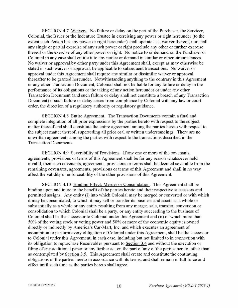 751008515 22727759 10 Purchase Agreement (ACMAT 2023 - 1) SECTION 4.7 Waivers . No failure or delay on the part of the Purchaser, the Servicer, Colonial, the Issuer or the Indenture Trustee in exercising any power or right hereunder (to the extent such Person has any power or right hereunder) shall operate as a waiver thereof, nor shall any single or partial exercise of any such power or right preclude any other or further exercise thereof or the exercise of any other power or right. No notice to or demand on the Purchaser or Colonial in any case shall entitle it to any notice or demand in similar or other circumstances. No waiver or approval by either party under this Agreement shall, except as may otherwise be stated in such waiver or approval, be applicable to subsequent transactions. No waiver or approval under this Agreement shall require any similar or dissimilar waiver or approval thereafter to be granted hereunder. Notwithstanding anything to the contrary in this Agreement or any other Transaction Document, Colonial shall not be liable for any failure or delay in the performance of its obligations or the taking of any action hereunder or under any other Transaction Document (and such failure or delay shall not constitute a breach of any Transaction Document) if such failure or delay arises from compliance by Colonial with any law or court order, the direction of a regulatory authority or regulatory guidance. SECTION 4.8 Entire Agreement . The Transaction Documents contain a final and complete integration of all prior expressions by the parties hereto with respect to the subject matter thereof and shall constitute the entire agreement among the parties hereto with respect to the subject matter thereof, superseding all prior oral or written understandings. There are no unwritten agreements among the parties with respect to the transactions described in the Transaction Documents. SECTION 4.9 Severability of Provisions . If any one or more of the covenants, agreements, provisions or terms of this Agreement shall be for any reason whatsoever held invalid, then such covenants, agreements, provisions or terms shall be deemed severable from the remaining covenants, agreements, provisions or terms of this Agreement and shall in no way affect the validity or enforceability of the other provisions of this Agreement. SECTION 4.10 Binding Effect; Merger or Consolidation . This Agreement shall be binding upon and inure to the benefit of the parties hereto and their respective successors and permitted assigns. Any entity (i) into which Colonial may be merged or converted or with which it may be consolidated, to which it may sell or transfer its business and assets as a whole or substantially as a whole or any entity resulting from any merger, sale, transfer, conversion or consolidation to which Colonial shall be a party, or any entity succeeding to the business of Colonial shall be the successor to Colonial under this Agreement and (ii) of which more than 50% of the voting stock or voting power and 50% or more of the economic equity is owned directly or indirectly by America’s Car - Mart, Inc. and which executes an agreement of assumption to perform every obligation of Colonial under this Agreement, shall be the successor to Colonial under this Agreement, in each case, including but not limited to in connection with its obligation to repurchase Receivables pursuant to Section 3.4 and without the execution or filing of any additional paper or any further act on the part of any of the parties hereto, other than as contemplated by Section 3.5 . This Agreement shall create and constitute the continuing obligations of the parties hereto in accordance with its terms, and shall remain in full force and effect until such time as the parties hereto shall agree.