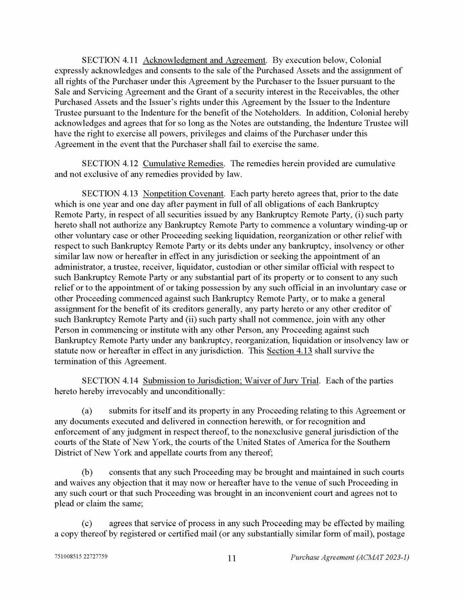 751008515 22727759 11 Purchase Agreement (ACMAT 2023 - 1) SECTION 4.11 Acknowledgment and Agreement . By execution below, Colonial expressly acknowledges and consents to the sale of the Purchased Assets and the assignment of all rights of the Purchaser under this Agreement by the Purchaser to the Issuer pursuant to the Sale and Servicing Agreement and the Grant of a security interest in the Receivables, the other Purchased Assets and the Issuer’s rights under this Agreement by the Issuer to the Indenture Trustee pursuant to the Indenture for the benefit of the Noteholders. In addition, Colonial hereby acknowledges and agrees that for so long as the Notes are outstanding, the Indenture Trustee will have the right to exercise all powers, privileges and claims of the Purchaser under this Agreement in the event that the Purchaser shall fail to exercise the same. SECTION 4.12 Cumulative Remedies . The remedies herein provided are cumulative and not exclusive of any remedies provided by law. SECTION 4.13 Nonpetition Covenant . Each party hereto agrees that, prior to the date which is one year and one day after payment in full of all obligations of each Bankruptcy Remote Party, in respect of all securities issued by any Bankruptcy Remote Party, (i) such party hereto shall not authorize any Bankruptcy Remote Party to commence a voluntary winding - up or other voluntary case or other Proceeding seeking liquidation, reorganization or other relief with respect to such Bankruptcy Remote Party or its debts under any bankruptcy, insolvency or other similar law now or hereafter in effect in any jurisdiction or seeking the appointment of an administrator, a trustee, receiver, liquidator, custodian or other similar official with respect to such Bankruptcy Remote Party or any substantial part of its property or to consent to any such relief or to the appointment of or taking possession by any such official in an involuntary case or other Proceeding commenced against such Bankruptcy Remote Party, or to make a general assignment for the benefit of its creditors generally, any party hereto or any other creditor of such Bankruptcy Remote Party and (ii) such party shall not commence, join with any other Person in commencing or institute with any other Person, any Proceeding against such Bankruptcy Remote Party under any bankruptcy, reorganization, liquidation or insolvency law or statute now or hereafter in effect in any jurisdiction. This Section 4.13 shall survive the termination of this Agreement. SECTION 4.14 Submission to Jurisdiction; Waiver of Jury Trial . Each of the parties hereto hereby irrevocably and unconditionally: (a) submits for itself and its property in any Proceeding relating to this Agreement or any documents executed and delivered in connection herewith, or for recognition and enforcement of any judgment in respect thereof, to the nonexclusive general jurisdiction of the courts of the State of New York, the courts of the United States of America for the Southern District of New York and appellate courts from any thereof; (b) consents that any such Proceeding may be brought and maintained in such courts and waives any objection that it may now or hereafter have to the venue of such Proceeding in any such court or that such Proceeding was brought in an inconvenient court and agrees not to plead or claim the same; (c) agrees that service of process in any such Proceeding may be effected by mailing a copy thereof by registered or certified mail (or any substantially similar form of mail), postage