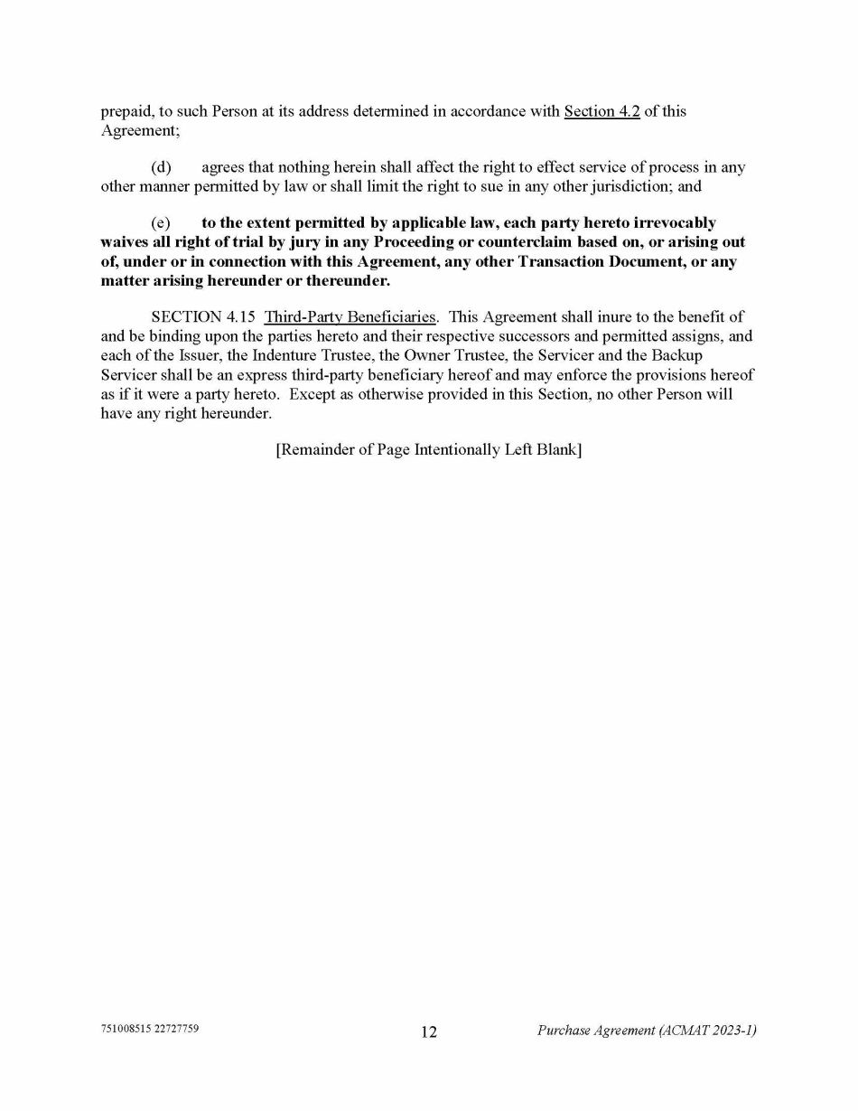 751008515 22727759 12 Purchase Agreement (ACMAT 2023 - 1) prepaid, to such Person at its address determined in accordance with Section 4.2 of this Agreement; (d) agrees that nothing herein shall affect the right to effect service of process in any other manner permitted by law or shall limit the right to sue in any other jurisdiction; and (e) to the extent permitted by applicable law, each party hereto irrevocably waives all right of trial by jury in any Proceeding or counterclaim based on, or arising out of, under or in connection with this Agreement, any other Transaction Document, or any matter arising hereunder or thereunder. SECTION 4.15 Third - Party Beneficiaries . This Agreement shall inure to the benefit of and be binding upon the parties hereto and their respective successors and permitted assigns, and each of the Issuer, the Indenture Trustee, the Owner Trustee, the Servicer and the Backup Servicer shall be an express third - party beneficiary hereof and may enforce the provisions hereof as if it were a party hereto. Except as otherwise provided in this Section, no other Person will have any right hereunder. [Remainder of Page Intentionally Left Blank]