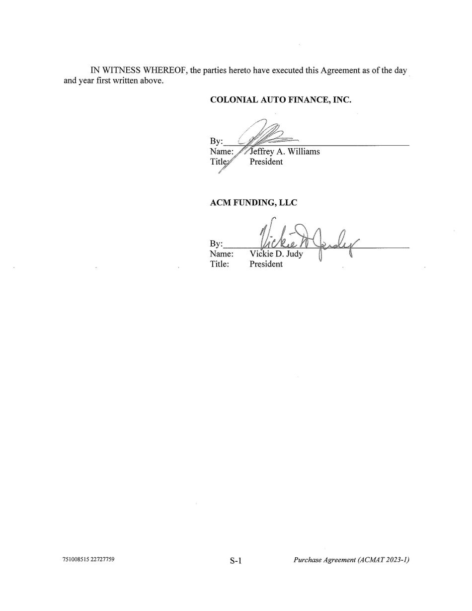 IN WITNESS WHEREOF, the parties hereto have executed this Agreement as of the day and year first written above. COLONIAL AUTO FINANCE, INC. By: = Name:/ effrey A. Williams TitY President "' ACM FUNDING, LLC By: Name: Title: ---- '/1£.LI." - ' Vickie D. Judy Pr sident 751008515 22727759 S - 1 Purchase Agreement (ACMAT 2023 - 1)