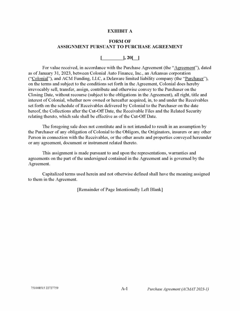 751008515 22727759 A - 1 Purchase Agreement (ACMAT 2023 - 1) EXHIBIT A FORM OF ASSIGNMENT PURSUANT TO PURCHASE AGREEMENT [ ], 20[ ] For value received, in accordance with the Purchase Agreement (the “ Agreement ”), dated as of January 31, 2023, between Colonial Auto Finance, Inc., an Arkansas corporation (“ Colonial ”), and ACM Funding, LLC, a Delaware limited liability company (the “ Purchaser ”), on the terms and subject to the conditions set forth in the Agreement, Colonial does hereby irrevocably sell, transfer, assign, contribute and otherwise convey to the Purchaser on the Closing Date, without recourse (subject to the obligations in the Agreement), all right, title and interest of Colonial, whether now owned or hereafter acquired, in, to and under the Receivables set forth on the schedule of Receivables delivered by Colonial to the Purchaser on the date hereof, the Collections after the Cut - Off Date, the Receivable Files and the Related Security relating thereto, which sale shall be effective as of the Cut - Off Date. The foregoing sale does not constitute and is not intended to result in an assumption by the Purchaser of any obligation of Colonial to the Obligors, the Originators, insurers or any other Person in connection with the Receivables, or the other assets and properties conveyed hereunder or any agreement, document or instrument related thereto. This assignment is made pursuant to and upon the representations, warranties and agreements on the part of the undersigned contained in the Agreement and is governed by the Agreement. Capitalized terms used herein and not otherwise defined shall have the meaning assigned to them in the Agreement. [Remainder of Page Intentionally Left Blank]