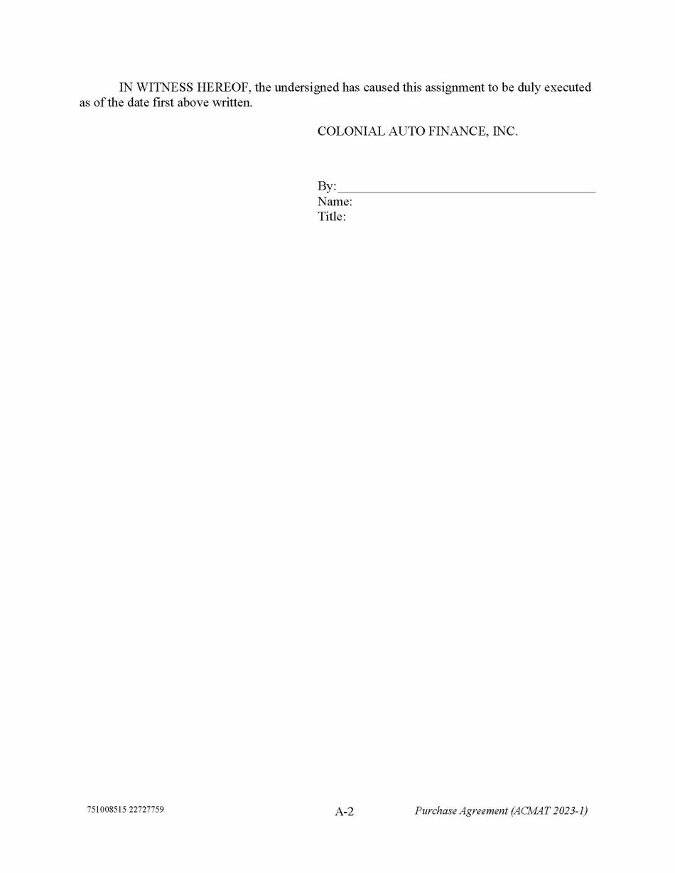 751008515 22727759 A - 2 Purchase Agreement (ACMAT 2023 - 1) IN WITNESS HEREOF, the undersigned has caused this assignment to be duly executed as of the date first above written. COLONIAL AUTO FINANCE, INC. By: Name: Title: