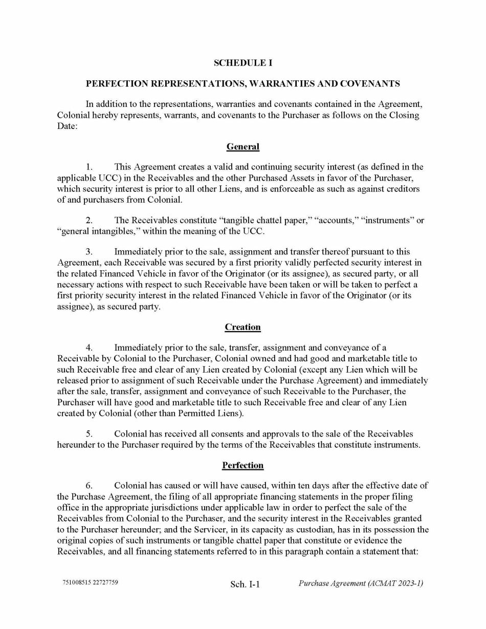 751008515 22727759 Sch. I - 1 Purchase Agreement (ACMAT 2023 - 1) SCHEDULE I PERFECTION REPRESENTATIONS, WARRANTIES AND COVENANTS In addition to the representations, warranties and covenants contained in the Agreement, Colonial hereby represents, warrants, and covenants to the Purchaser as follows on the Closing Date: General 1. This Agreement creates a valid and continuing security interest (as defined in the applicable UCC) in the Receivables and the other Purchased Assets in favor of the Purchaser, which security interest is prior to all other Liens, and is enforceable as such as against creditors of and purchasers from Colonial. 2. The Receivables constitute “tangible chattel paper,” “accounts,” “instruments” or “general intangibles,” within the meaning of the UCC. 3. Immediately prior to the sale, assignment and transfer thereof pursuant to this Agreement, each Receivable was secured by a first priority validly perfected security interest in the related Financed Vehicle in favor of the Originator (or its assignee), as secured party, or all necessary actions with respect to such Receivable have been taken or will be taken to perfect a first priority security interest in the related Financed Vehicle in favor of the Originator (or its assignee), as secured party. Creation 4. Immediately prior to the sale, transfer, assignment and conveyance of a Receivable by Colonial to the Purchaser, Colonial owned and had good and marketable title to such Receivable free and clear of any Lien created by Colonial (except any Lien which will be released prior to assignment of such Receivable under the Purchase Agreement) and immediately after the sale, transfer, assignment and conveyance of such Receivable to the Purchaser, the Purchaser will have good and marketable title to such Receivable free and clear of any Lien created by Colonial (other than Permitted Liens). 5. Colonial has received all consents and approvals to the sale of the Receivables hereunder to the Purchaser required by the terms of the Receivables that constitute instruments. Perfection 6. Colonial has caused or will have caused, within ten days after the effective date of the Purchase Agreement, the filing of all appropriate financing statements in the proper filing office in the appropriate jurisdictions under applicable law in order to perfect the sale of the Receivables from Colonial to the Purchaser, and the security interest in the Receivables granted to the Purchaser hereunder; and the Servicer, in its capacity as custodian, has in its possession the original copies of such instruments or tangible chattel paper that constitute or evidence the Receivables, and all financing statements referred to in this paragraph contain a statement that: