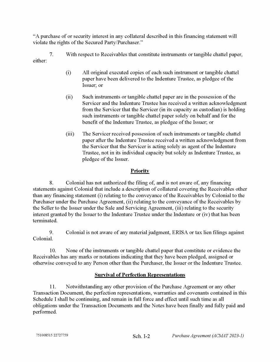 751008515 22727759 Sch. I - 2 Purchase Agreement (ACMAT 2023 - 1) “A purchase of or security interest in any collateral described in this financing statement will violate the rights of the Secured Party/Purchaser.” 7. With respect to Receivables that constitute instruments or tangible chattel paper, either: (i) All original executed copies of each such instrument or tangible chattel paper have been delivered to the Indenture Trustee, as pledgee of the Issuer; or (ii) Such instruments or tangible chattel paper are in the possession of the Servicer and the Indenture Trustee has received a written acknowledgment from the Servicer that the Servicer (in its capacity as custodian) is holding such instruments or tangible chattel paper solely on behalf and for the benefit of the Indenture Trustee, as pledgee of the Issuer; or (iii) The Servicer received possession of such instruments or tangible chattel paper after the Indenture Trustee received a written acknowledgment from the Servicer that the Servicer is acting solely as agent of the Indenture Trustee, not in its individual capacity but solely as Indenture Trustee, as pledgee of the Issuer. Priority 8. Colonial has not authorized the filing of, and is not aware of, any financing statements against Colonial that include a description of collateral covering the Receivables other than any financing statement (i) relating to the conveyance of the Receivables by Colonial to the Purchaser under the Purchase Agreement, (ii) relating to the conveyance of the Receivables by the Seller to the Issuer under the Sale and Servicing Agreement, (iii) relating to the security interest granted by the Issuer to the Indenture Trustee under the Indenture or (iv) that has been terminated. 9. Colonial is not aware of any material judgment, ERISA or tax lien filings against Colonial. 10. None of the instruments or tangible chattel paper that constitute or evidence the Receivables has any marks or notations indicating that they have been pledged, assigned or otherwise conveyed to any Person other than the Purchaser, the Issuer or the Indenture Trustee. Survival of Perfection Representations 11. Notwithstanding any other provision of the Purchase Agreement or any other Transaction Document, the perfection representations, warranties and covenants contained in this Schedule I shall be continuing, and remain in full force and effect until such time as all obligations under the Transaction Documents and the Notes have been finally and fully paid and performed.