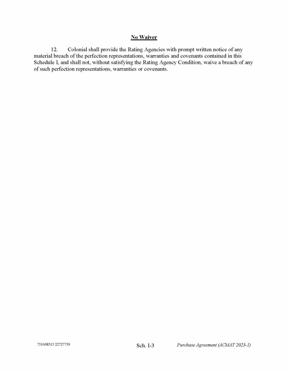 751008515 22727759 Sch. I - 3 Purchase Agreement (ACMAT 2023 - 1) No Waiver 12. Colonial shall provide the Rating Agencies with prompt written notice of any material breach of the perfection representations, warranties and covenants contained in this Schedule I, and shall not, without satisfying the Rating Agency Condition, waive a breach of any of such perfection representations, warranties or covenants.