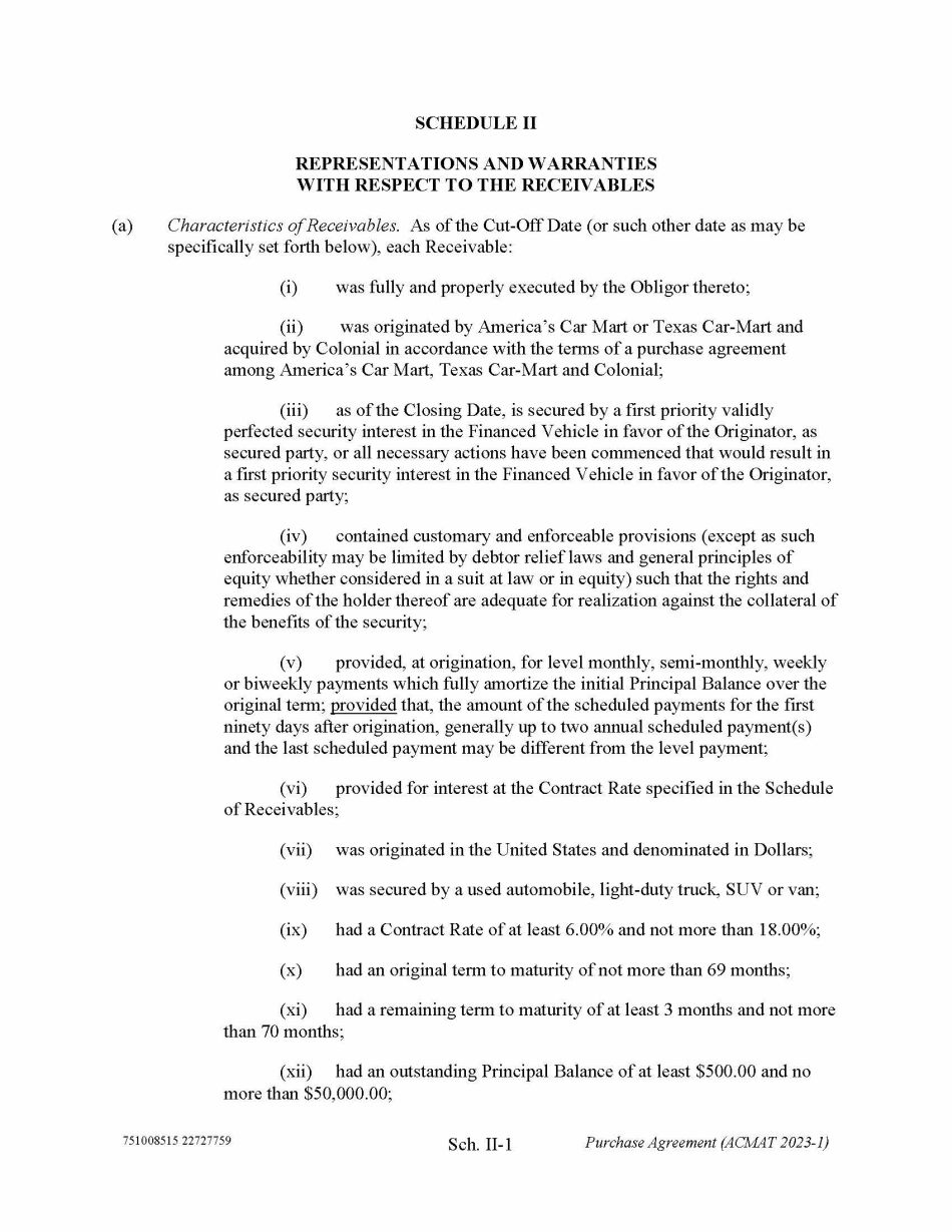 751008515 22727759 Sch. II - 1 Purchase Agreement (ACMAT 2023 - 1) SCHEDULE II REPRESENTATIONS AND WARRANTIES WITH RESPECT TO THE RECEIVABLES (a) Characteristics of Receivables . As of the Cut - Off Date (or such other date as may be specifically set forth below), each Receivable: (i) was fully and properly executed by the Obligor thereto; (ii) was originated by America’s Car Mart or Texas Car - Mart and acquired by Colonial in accordance with the terms of a purchase agreement among America’s Car Mart, Texas Car - Mart and Colonial; (iii) as of the Closing Date, is secured by a first priority validly perfected security interest in the Financed Vehicle in favor of the Originator, as secured party, or all necessary actions have been commenced that would result in a first priority security interest in the Financed Vehicle in favor of the Originator, as secured party; (iv) contained customary and enforceable provisions (except as such enforceability may be limited by debtor relief laws and general principles of equity whether considered in a suit at law or in equity) such that the rights and remedies of the holder thereof are adequate for realization against the collateral of the benefits of the security; (v) provided, at origination, for level monthly, semi - monthly, weekly or biweekly payments which fully amortize the initial Principal Balance over the original term; provided that, the amount of the scheduled payments for the first ninety days after origination, generally up to two annual scheduled payment(s) and the last scheduled payment may be different from the level payment; (vi) provided for interest at the Contract Rate specified in the Schedule of Receivables; (vii) was originated in the United States and denominated in Dollars; (viii) was secured by a used automobile, light - duty truck, SUV or van; (ix) had a Contract Rate of at least 6.00% and not more than 18.00%; (x) had an original term to maturity of not more than 69 months; (xi) had a remaining term to maturity of at least 3 months and not more than 70 months; (xii) had an outstanding Principal Balance of at least $500.00 and no more than $50,000.00;