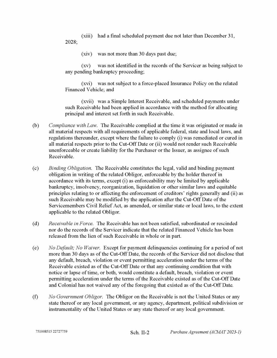 751008515 22727759 Sch. II - 2 Purchase Agreement (ACMAT 2023 - 1) (xiii) had a final scheduled payment due not later than December 31, 2028; (xiv) was not more than 30 days past due; (xv) was not identified in the records of the Servicer as being subject to any pending bankruptcy proceeding; (xvi) was not subject to a force - placed Insurance Policy on the related Financed Vehicle; and (xvii) was a Simple Interest Receivable, and scheduled payments under such Receivable had been applied in accordance with the method for allocating principal and interest set forth in such Receivable. (b) Compliance with Law. The Receivable complied at the time it was originated or made in all material respects with all requirements of applicable federal, state and local laws, and regulations thereunder, except where the failure to comply (i) was remediated or cured in all material respects prior to the Cut - Off Date or (ii) would not render such Receivable unenforceable or create liability for the Purchaser or the Issuer, as assignee of such Receivable. (c) Binding Obligation. The Receivable constitutes the legal, valid and binding payment obligation in writing of the related Obligor, enforceable by the holder thereof in accordance with its terms, except (i) as enforceability may be limited by applicable bankruptcy, insolvency, reorganization, liquidation or other similar laws and equitable principles relating to or affecting the enforcement of creditors’ rights generally and (ii) as such Receivable may be modified by the application after the Cut - Off Date of the Servicemembers Civil Relief Act, as amended, or similar state or local laws, to the extent applicable to the related Obligor. (d) Receivable in Force. The Receivable has not been satisfied, subordinated or rescinded nor do the records of the Servicer indicate that the related Financed Vehicle has been released from the lien of such Receivable in whole or in part. (e) No Default; No Waiver. Except for payment delinquencies continuing for a period of not more than 30 days as of the Cut - Off Date, the records of the Servicer did not disclose that any default, breach, violation or event permitting acceleration under the terms of the Receivable existed as of the Cut - Off Date or that any continuing condition that with notice or lapse of time, or both, would constitute a default, breach, violation or event permitting acceleration under the terms of the Receivable existed as of the Cut - Off Date and Colonial has not waived any of the foregoing that existed as of the Cut - Off Date . (f) No Government Obligor. The Obligor on the Receivable is not the United States or any state thereof or any local government, or any agency, department, political subdivision or instrumentality of the United States or any state thereof or any local government.