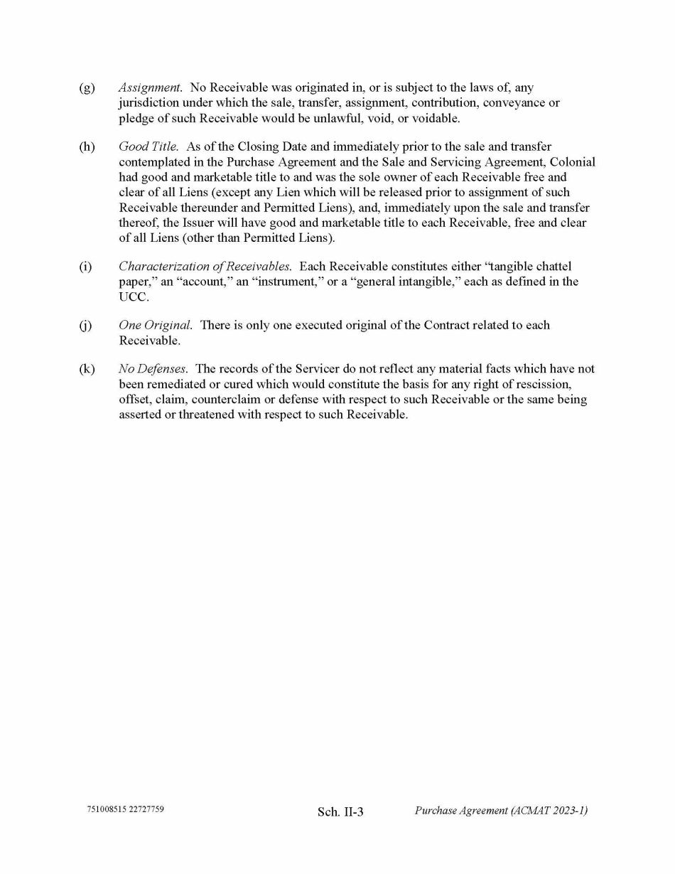 751008515 22727759 Sch. II - 3 Purchase Agreement (ACMAT 2023 - 1) (g) Assignment. No Receivable was originated in, or is subject to the laws of, any jurisdiction under which the sale, transfer, assignment, contribution, conveyance or pledge of such Receivable would be unlawful, void, or voidable. (h) Good Title. As of the Closing Date and immediately prior to the sale and transfer contemplated in the Purchase Agreement and the Sale and Servicing Agreement, Colonial had good and marketable title to and was the sole owner of each Receivable free and clear of all Liens (except any Lien which will be released prior to assignment of such Receivable thereunder and Permitted Liens), and, immediately upon the sale and transfer thereof, the Issuer will have good and marketable title to each Receivable, free and clear of all Liens (other than Permitted Liens). (i) Characterization of Receivables. Each Receivable constitutes either “tangible chattel paper,” an “account,” an “instrument,” or a “general intangible,” each as defined in the UCC. (j) One Original. There is only one executed original of the Contract related to each Receivable. (k) No Defenses . The records of the Servicer do not reflect any material facts which have not been remediated or cured which would constitute the basis for any right of rescission, offset, claim, counterclaim or defense with respect to such Receivable or the same being asserted or threatened with respect to such Receivable.