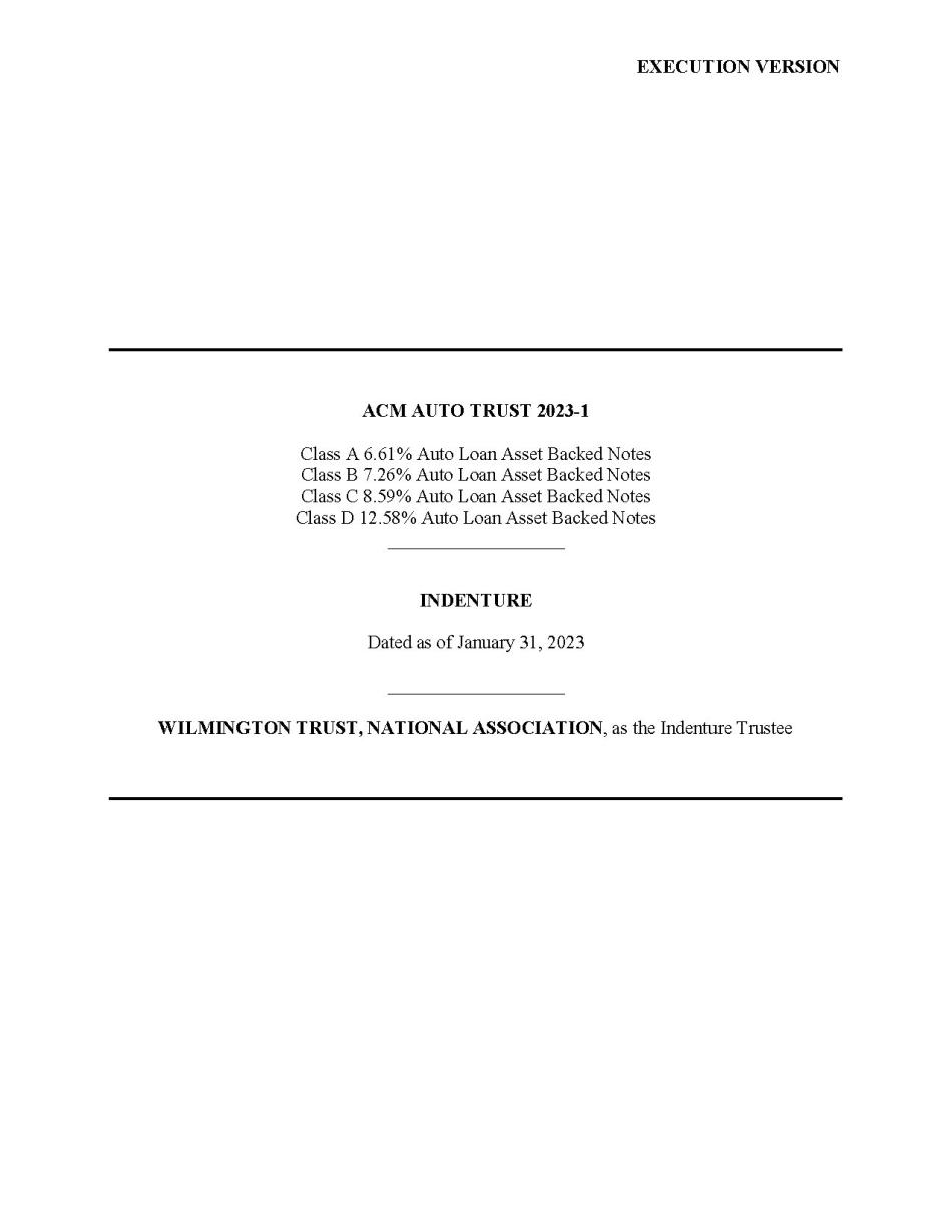 EXECUTION VERSION ACM AUTO TRUST 2023 - 1 Class A 6 . 61 % Auto Loan Asset Backed Notes Class B 7 . 26 % Auto Loan Asset Backed Notes Class C 8 . 59 % Auto Loan Asset Backed Notes Class D 12 . 58 % Auto Loan Asset Backed Notes INDENTURE Dated as of January 31, 2023 WILMINGTON TRUST, NATIONAL ASSOCIATION , as the Indenture Trustee