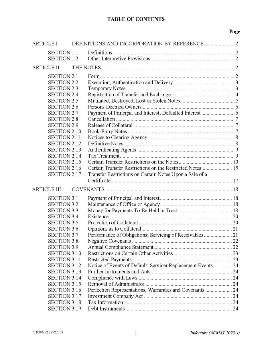 751008852 22727759 i Indenture (ACMAT 2023 - 1) TABLE OF CONTENTS Page ARTICLE I DEFINITIONS AND INCORPORATION BY REFERENCE ....................... 2 SECTION 1.1 SECTION 1.2 Definitions............................................................................................ 2 Other Interpretive Provisions ............................................................... 2 ARTICLE II THE NOTES .................................................................................................... 2 SECTION 2.1 SECTION 2.2 SECTION 2.3 SECTION 2.4 SECTION 2.5 SECTION 2.6 SECTION 2.7 SECTION 2.8 SECTION 2.9 SECTION 2.10 SECTION 2.11 SECTION 2.12 SECTION 2.13 SECTION 2.14 SECTION 2.15 SECTION 2.16 SECTION 2.17 Form ..................................................................................................... 2 Execution, Authentication and Delivery .............................................. 3 Temporary Notes ................................................................................. 3 Registration of Transfer and Exchange................................................ 4 Mutilated, Destroyed, Lost or Stolen Notes......................................... 5 Persons Deemed Owners ..................................................................... 6 Payment of Principal and Interest; Defaulted Interest ......................... 6 Cancellation ......................................................................................... 7 Release of Collateral ............................................................................ 7 Book - Entry Notes ................................................................................ 7 Notices to Clearing Agency ................................................................. 8 Definitive Notes ................................................................................... 8 Authenticating Agents ......................................................................... 9 Tax Treatment ...................................................................................... 9 Certain Transfer Restrictions on the Notes ........................................ 10 Certain Transfer Restrictions on the Restricted Notes....................... 15 Transfer Restrictions on Certain Notes Upon a Sale of a Certificate........................................................................................... 17 ARTICLE III COVENANTS ............................................................................................... 18 SECTION 3.1 SECTION 3.2 SECTION 3.3 SECTION 3.4 SECTION 3.5 SECTION 3.6 SECTION 3.7 SECTION 3.8 SECTION 3.9 SECTION 3.10 SECTION 3.11 SECTION 3.12 SECTION 3.13 SECTION 3.14 SECTION 3.15 SECTION 3.16 SECTION 3.17 SECTION 3.18 SECTION 3.19 Payment of Principal and Interest ...................................................... 18 Maintenance of Office or Agency...................................................... 18 Money for Payments To Be Held in Trust......................................... 18 Existence ............................................................................................ 20 Protection of Collateral ...................................................................... 20 Opinions as to Collateral.................................................................... 21 Performance of Obligations; Servicing of Receivables ..................... 21 Negative Covenants ........................................................................... 22 Annual Compliance Statement .......................................................... 22 Restrictions on Certain Other Activities ............................................ 23 Restricted Payments........................................................................... 23 Notice of Events of Default; Servicer Replacement Events .............. 24 Further Instruments and Acts............................................................. 24 Compliance with Laws ...................................................................... 24 Removal of Administrator ................................................................. 24 Perfection Representations, Warranties and Covenants .................... 24 Investment Company Act .................................................................. 24 Tax Information ................................................................................. 24 Debt Instruments ................................................................................ 24