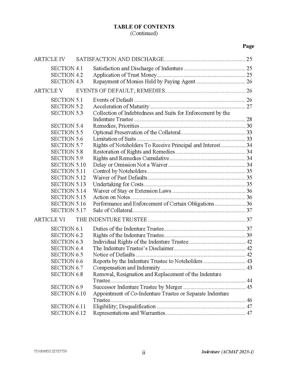 751008852 22727759 ii Indenture (ACMAT 2023 - 1) TABLE OF CONTENTS (Continued) Page ARTICLE IV SATISFACTION AND DISCHARGE.......................................................... 25 SECTION 4.1 SECTION 4.2 SECTION 4.3 Satisfaction and Discharge of Indenture ............................................ 25 Application of Trust Money............................................................... 25 Repayment of Monies Held by Paying Agent ................................... 26 ARTICLE V EVENTS OF DEFAULT; REMEDIES......................................................... 26 SECTION 5.1 SECTION 5.2 SECTION 5.3 Events of Default ............................................................................... 26 Acceleration of Maturity.................................................................... 27 Collection of Indebtedness and Suits for Enforcement by the Indenture Trustee ............................................................................... 28 Remedies; Priorities ........................................................................... 30 Optional Preservation of the Collateral.............................................. 33 Limitation of Suits ............................................................................. 33 Rights of Noteholders To Receive Principal and Interest.................. 34 Restoration of Rights and Remedies.................................................. 34 Rights and Remedies Cumulative ...................................................... 34 Delay or Omission Not a Waiver ....................................................... 34 Control by Noteholders...................................................................... 35 Waiver of Past Defaults ..................................................................... 35 Undertaking for Costs ........................................................................ 35 Waiver of Stay or Extension Laws .................................................... 36 Action on Notes ................................................................................. 36 Performance and Enforcement of Certain Obligations ...................... 36 Sale of Collateral................................................................................ 37 SECTION 5.4 SECTION 5.5 SECTION 5.6 SECTION 5.7 SECTION 5.8 SECTION 5.9 SECTION 5.10 SECTION 5.11 SECTION 5.12 SECTION 5.13 SECTION 5.14 SECTION 5.15 SECTION 5.16 SECTION 5.17 ARTICLE VI THE INDENTURE TRUSTEE ..................................................................... 37 SECTION 6.1 SECTION 6.2 SECTION 6.3 SECTION 6.4 SECTION 6.5 SECTION 6.6 SECTION 6.7 SECTION 6.8 Duties of the Indenture Trustee.......................................................... 37 Rights of the Indenture Trustee.......................................................... 39 Individual Rights of the Indenture Trustee ........................................ 42 The Indenture Trustee’s Disclaimer................................................... 42 Notice of Defaults .............................................................................. 42 Reports by the Indenture Trustee to Noteholders .............................. 43 Compensation and Indemnity ............................................................ 43 Removal, Resignation and Replacement of the Indenture Trustee................................................................................................ 44 Successor Indenture Trustee by Merger ............................................ 45 Appointment of Co - Indenture Trustee or Separate Indenture Trustee................................................................................................ 46 Eligibility; Disqualification ............................................................... 47 Representations and Warranties......................................................... 47 SECTION 6.9 SECTION 6.10 SECTION 6.11 SECTION 6.12