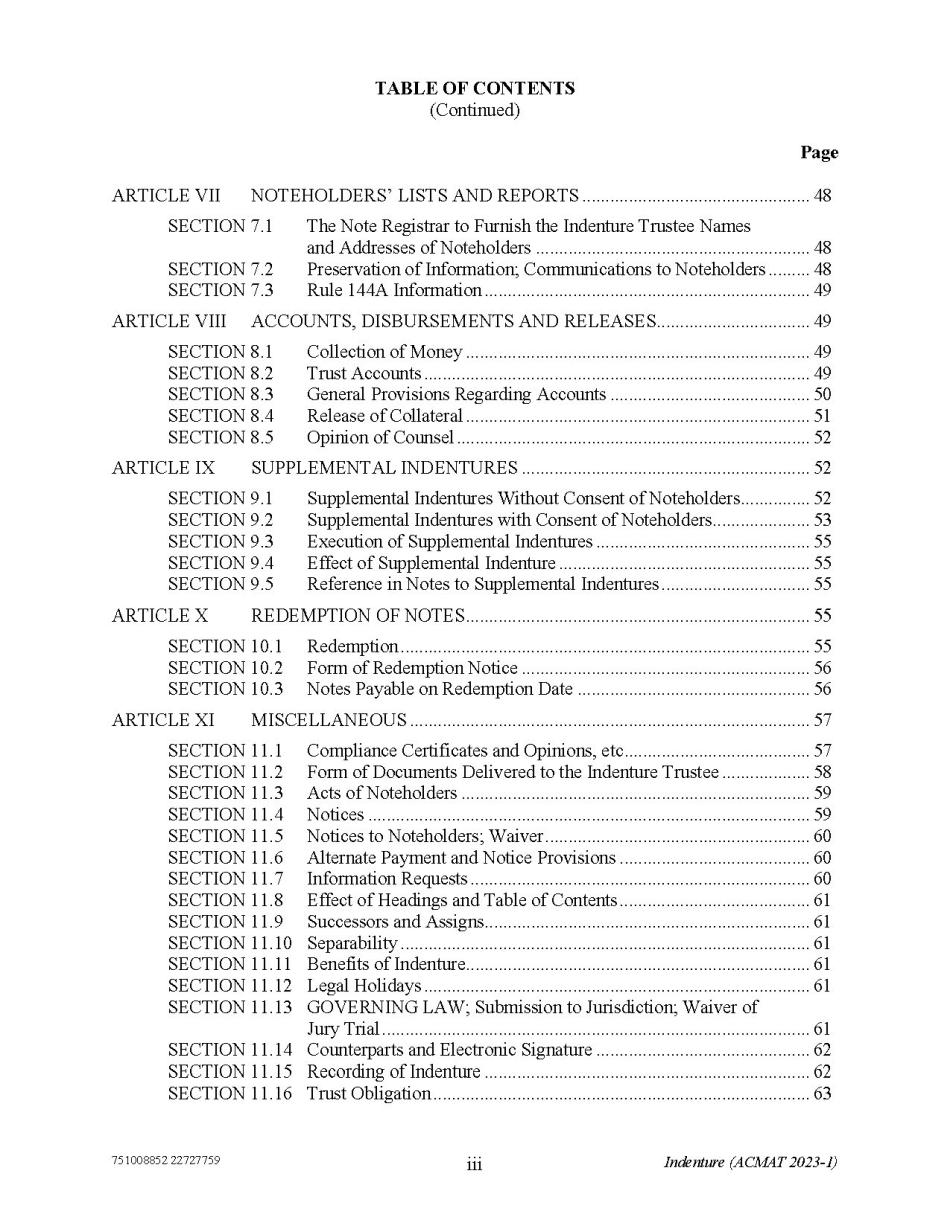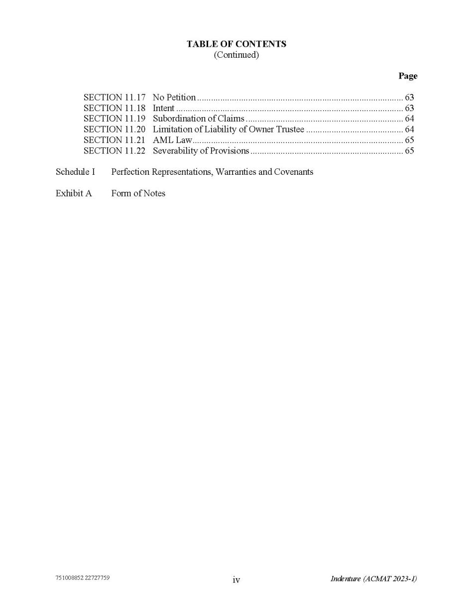 751008852 22727759 iii Indenture (ACMAT 2023 - 1) TABLE OF CONTENTS (Continued) Page ARTICLE VII NOTEHOLDERS’ LISTS AND REPORTS ................................................. 48 SECTION 7.1 The Note Registrar to Furnish the Indenture Trustee Names and Addresses of Noteholders ........................................................... 48 Preservation of Information; Communications to Noteholders ......... 48 Rule 144A Information ...................................................................... 49 SECTION 7.2 SECTION 7.3 ARTICLE VIII ACCOUNTS, DISBURSEMENTS AND RELEASES................................. 49 SECTION 8.1 SECTION 8.2 SECTION 8.3 SECTION 8.4 SECTION 8.5 Collection of Money .......................................................................... 49 Trust Accounts ................................................................................... 49 General Provisions Regarding Accounts ........................................... 50 Release of Collateral .......................................................................... 51 Opinion of Counsel ............................................................................ 52 ARTICLE IX SUPPLEMENTAL INDENTURES .............................................................. 52 SECTION 9.1 SECTION 9.2 SECTION 9.3 SECTION 9.4 SECTION 9.5 Supplemental Indentures Without Consent of Noteholders ............... 52 Supplemental Indentures with Consent of Noteholders ..................... 53 Execution of Supplemental Indentures .............................................. 55 Effect of Supplemental Indenture ...................................................... 55 Reference in Notes to Supplemental Indentures ................................ 55 ARTICLE X REDEMPTION OF NOTES.......................................................................... 55 SECTION 10.1 SECTION 10.2 SECTION 10.3 Redemption ........................................................................................ 55 Form of Redemption Notice .............................................................. 56 Notes Payable on Redemption Date .................................................. 56 ARTICLE XI MISCELLANEOUS ...................................................................................... 57 SECTION 11.1 SECTION 11.2 SECTION 11.3 SECTION 11.4 SECTION 11.5 SECTION 11.6 SECTION 11.7 SECTION 11.8 SECTION 11.9 SECTION 11.10 SECTION 11.11 SECTION 11.12 SECTION 11.13 Compliance Certificates and Opinions, etc ........................................ 57 Form of Documents Delivered to the Indenture Trustee ................... 58 Acts of Noteholders ........................................................................... 59 Notices ............................................................................................... 59 Notices to Noteholders ; Waiver ......................................................... 60 Alternate Payment and Notice Provisions ......................................... 60 Information Requests ......................................................................... 60 Effect of Headings and Table of Contents ......................................... 61 Successors and Assigns ...................................................................... 61 Separability ........................................................................................ 61 Benefits of Indenture .......................................................................... 61 Legal Holidays ................................................................................... 61 GOVERNING LAW ; Submission to Jurisdiction ; Waiver of Jury Trial ............................................................................................ 61 Counterparts and Electronic Signature .............................................. 62 Recording of Indenture ...................................................................... 62 Trust Obligation ................................................................................. 63 SECTION 11.14 SECTION 11.15 SECTION 11.16