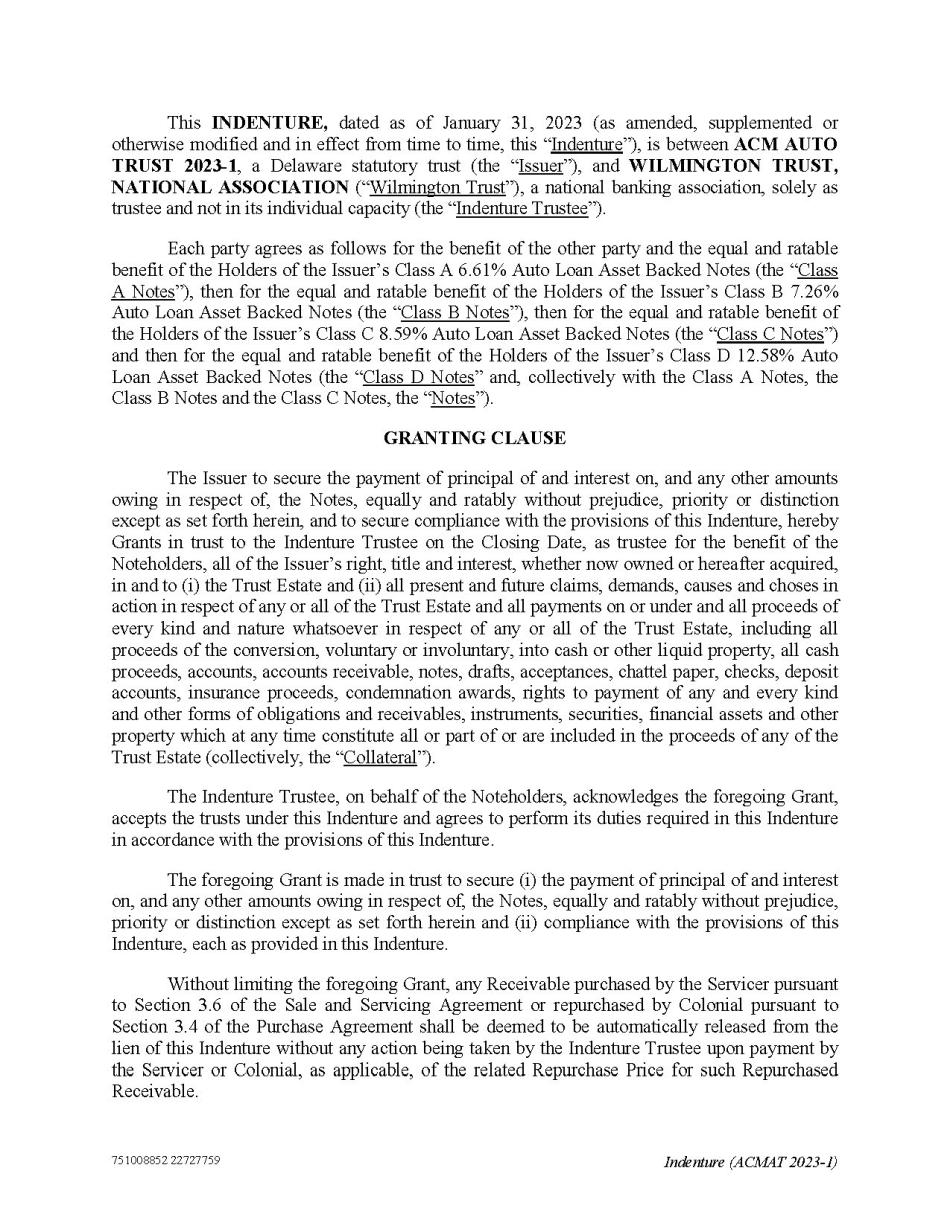 751008852 22727759 Indenture (ACMAT 2023 - 1) This INDENTURE, dated as of January 31 , 2023 (as amended, supplemented or otherwise modified and in effect from time to time, this “ Indenture ”), is between ACM AUTO TRUST 2023 - 1 , a Delaware statutory trust (the “ Issuer ”), and WILMINGTON TRUST, NATIONAL ASSOCIATION (“ Wilmington Trust ”), a national banking association, solely as trustee and not in its individual capacity (the “ Indenture Trustee ”) . Each party agrees as follows for the benefit of the other party and the equal and ratable benefit of the Holders of the Issuer’s Class A 6 . 61 % Auto Loan Asset Backed Notes (the “ Class A Notes ”), then for the equal and ratable benefit of the Holders of the Issuer’s Class B 7 . 26 % Auto Loan Asset Backed Notes (the “ Class B Notes ”), then for the equal and ratable benefit of the Holders of the Issuer’s Class C 8 . 59 % Auto Loan Asset Backed Notes (the “ Class C Notes ”) and then for the equal and ratable benefit of the Holders of the Issuer’s Class D 12 . 58 % Auto Loan Asset Backed Notes (the “ Class D Notes ” and, collectively with the Class A Notes, the Class B Notes and the Class C Notes, the “ Notes ”) . GRANTING CLAUSE The Issuer to secure the payment of principal of and interest on, and any other amounts owing in respect of, the Notes, equally and ratably without prejudice, priority or distinction except as set forth herein, and to secure compliance with the provisions of this Indenture, hereby Grants in trust to the Indenture Trustee on the Closing Date, as trustee for the benefit of the Noteholders, all of the Issuer’s right, title and interest, whether now owned or hereafter acquired, in and to (i) the Trust Estate and (ii) all present and future claims, demands, causes and choses in action in respect of any or all of the Trust Estate and all payments on or under and all proceeds of every kind and nature whatsoever in respect of any or all of the Trust Estate, including all proceeds of the conversion, voluntary or involuntary, into cash or other liquid property, all cash proceeds, accounts, accounts receivable, notes, drafts, acceptances, chattel paper, checks, deposit accounts, insurance proceeds, condemnation awards, rights to payment of any and every kind and other forms of obligations and receivables, instruments, securities, financial assets and other property which at any time constitute all or part of or are included in the proceeds of any of the Trust Estate (collectively, the “ Collateral ”) . The Indenture Trustee, on behalf of the Noteholders, acknowledges the foregoing Grant, accepts the trusts under this Indenture and agrees to perform its duties required in this Indenture in accordance with the provisions of this Indenture . The foregoing Grant is made in trust to secure (i) the payment of principal of and interest on, and any other amounts owing in respect of, the Notes, equally and ratably without prejudice, priority or distinction except as set forth herein and (ii) compliance with the provisions of this Indenture, each as provided in this Indenture . Without limiting the foregoing Grant, any Receivable purchased by the Servicer pursuant to Section 3 . 6 of the Sale and Servicing Agreement or repurchased by Colonial pursuant to Section 3 . 4 of the Purchase Agreement shall be deemed to be automatically released from the lien of this Indenture without any action being taken by the Indenture Trustee upon payment by the Servicer or Colonial, as applicable, of the related Repurchase Price for such Repurchased Receivable .
