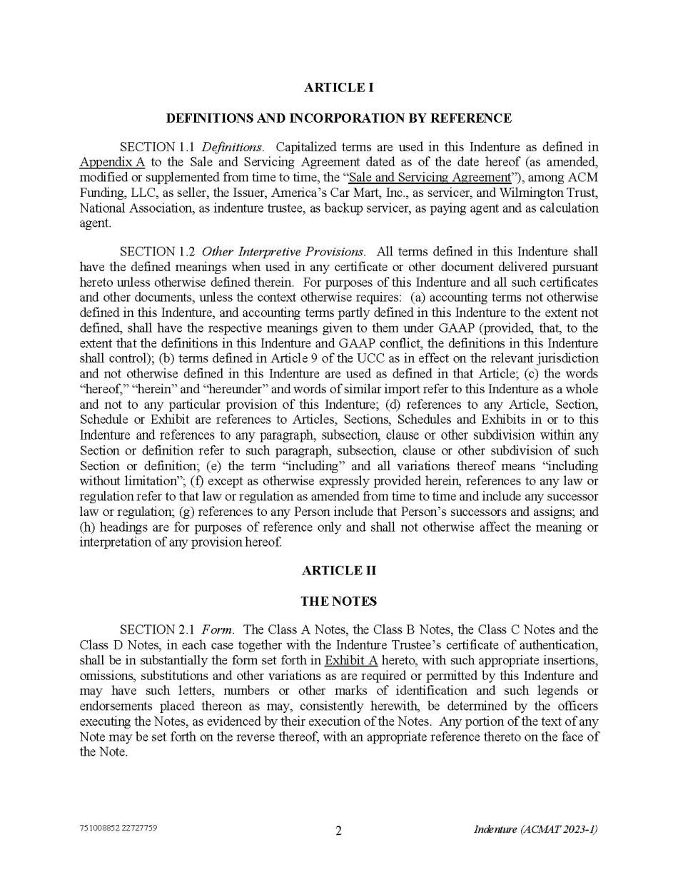 751008852 22727759 2 Indenture (ACMAT 2023 - 1) ARTICLE I DEFINITIONS AND INCORPORATION BY REFERENCE SECTION 1 . 1 Definitions . Capitalized terms are used in this Indenture as defined in Appendix A to the Sale and Servicing Agreement dated as of the date hereof (as amended, modified or supplemented from time to time, the “ Sale and Servicing Agreement ”), among ACM Funding, LLC, as seller, the Issuer, America’s Car Mart, Inc . , as servicer, and Wilmington Trust, National Association, as indenture trustee, as backup servicer, as paying agent and as calculation agent . SECTION 1 . 2 Other Interpretive Provisions . All terms defined in this Indenture shall have the defined meanings when used in any certificate or other document delivered pursuant hereto unless otherwise defined therein . For purposes of this Indenture and all such certificates and other documents, unless the context otherwise requires : (a) accounting terms not otherwise defined in this Indenture, and accounting terms partly defined in this Indenture to the extent not defined, shall have the respective meanings given to them under GAAP (provided, that, to the extent that the definitions in this Indenture and GAAP conflict, the definitions in this Indenture shall control) ; (b) terms defined in Article 9 of the UCC as in effect on the relevant jurisdiction and not otherwise defined in this Indenture are used as defined in that Article ; (c) the words “hereof,” “herein” and “hereunder” and words of similar import refer to this Indenture as a whole and not to any particular provision of this Indenture ; (d) references to any Article, Section, Schedule or Exhibit are references to Articles, Sections, Schedules and Exhibits in or to this Indenture and references to any paragraph, subsection, clause or other subdivision within any Section or definition refer to such paragraph, subsection, clause or other subdivision of such Section or definition ; (e) the term “including” and all variations thereof means “including without limitation” ; (f) except as otherwise expressly provided herein, references to any law or regulation refer to that law or regulation as amended from time to time and include any successor law or regulation ; (g) references to any Person include that Person’s successors and assigns ; and (h) headings are for purposes of reference only and shall not otherwise affect the meaning or interpretation of any provision hereof . ARTICLE II THE NOTES SECTION 2 . 1 Form . The Class A Notes, the Class B Notes, the Class C Notes and the Class D Notes, in each case together with the Indenture Trustee’s certificate of authentication, shall be in substantially the form set forth in Exhibit A hereto, with such appropriate insertions, omissions, substitutions and other variations as are required or permitted by this Indenture and may have such letters, numbers or other marks of identification and such legends or endorsements placed thereon as may, consistently herewith, be determined by the officers executing the Notes, as evidenced by their execution of the Notes . Any portion of the text of any Note may be set forth on the reverse thereof, with an appropriate reference thereto on the face of the Note .