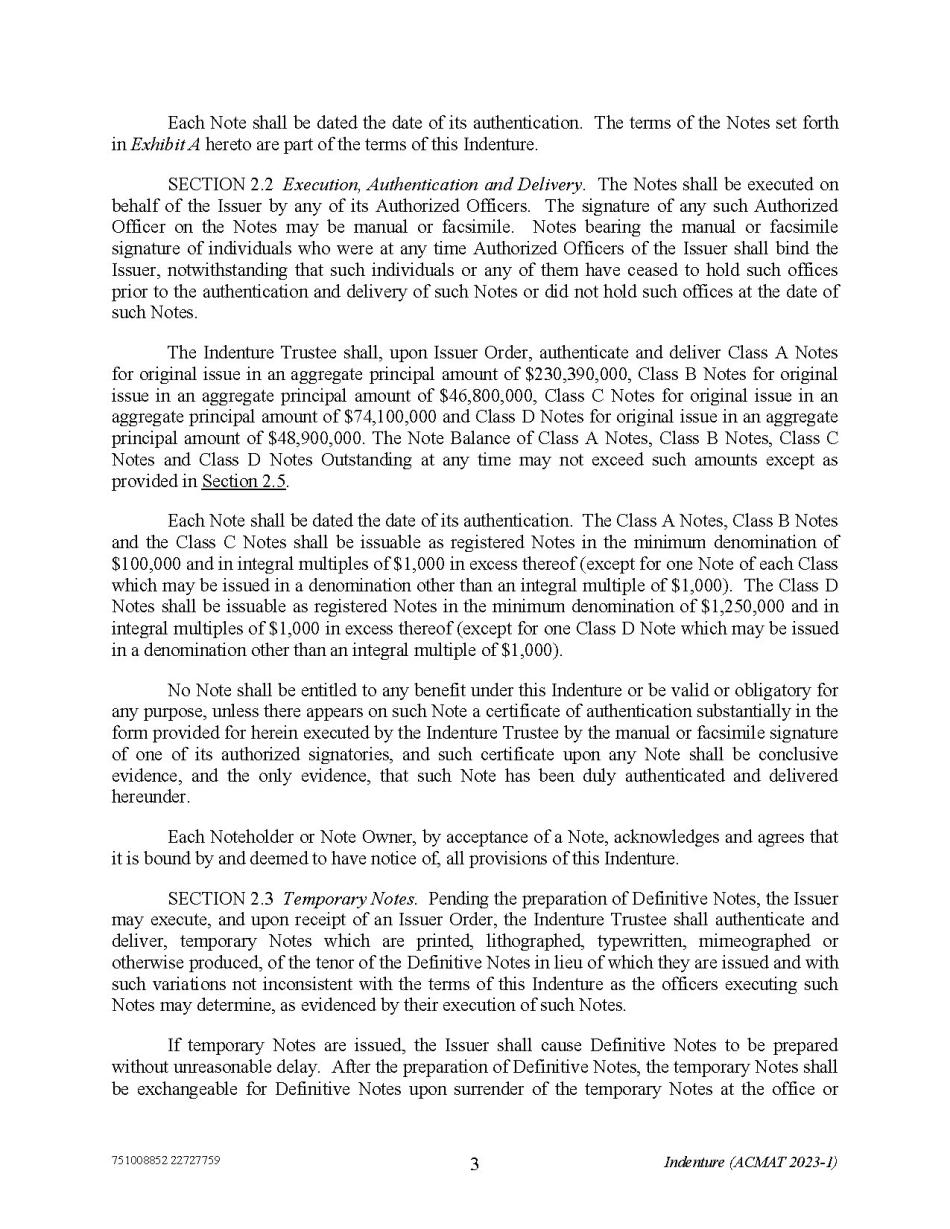 751008852 22727759 3 Indenture (ACMAT 2023 - 1) Each Note shall be dated the date of its authentication . The terms of the Notes set forth in Exhibit A hereto are part of the terms of this Indenture . SECTION 2 . 2 Execution, Authentication and Delivery . The Notes shall be executed on behalf of the Issuer by any of its Authorized Officers . The signature of any such Authorized Officer on the Notes may be manual or facsimile . Notes bearing the manual or facsimile signature of individuals who were at any time Authorized Officers of the Issuer shall bind the Issuer, notwithstanding that such individuals or any of them have ceased to hold such offices prior to the authentication and delivery of such Notes or did not hold such offices at the date of such Notes . The Indenture Trustee shall, upon Issuer Order, authenticate and deliver Class A Notes for original issue in an aggregate principal amount of $ 230 , 390 , 000 , Class B Notes for original issue in an aggregate principal amount of $ 46 , 800 , 000 , Class C Notes for original issue in an aggregate principal amount of $ 74 , 100 , 000 and Class D Notes for original issue in an aggregate principal amount of $ 48 , 900 , 000 . The Note Balance of Class A Notes, Class B Notes, Class C Notes and Class D Notes Outstanding at any time may not exceed such amounts except as provided in Section 2 . 5 . Each Note shall be dated the date of its authentication . The Class A Notes, Class B Notes and the Class C Notes shall be issuable as registered Notes in the minimum denomination of $ 100 , 000 and in integral multiples of $ 1 , 000 in excess thereof (except for one Note of each Class which may be issued in a denomination other than an integral multiple of $ 1 , 000 ) . The Class D Notes shall be issuable as registered Notes in the minimum denomination of $ 1 , 250 , 000 and in integral multiples of $ 1 , 000 in excess thereof (except for one Class D Note which may be issued in a denomination other than an integral multiple of $ 1 , 000 ) . No Note shall be entitled to any benefit under this Indenture or be valid or obligatory for any purpose, unless there appears on such Note a certificate of authentication substantially in the form provided for herein executed by the Indenture Trustee by the manual or facsimile signature of one of its authorized signatories, and such certificate upon any Note shall be conclusive evidence, and the only evidence, that such Note has been duly authenticated and delivered hereunder . Each Noteholder or Note Owner, by acceptance of a Note, acknowledges and agrees that it is bound by and deemed to have notice of, all provisions of this Indenture . SECTION 2 . 3 Temporary Notes . Pending the preparation of Definitive Notes, the Issuer may execute, and upon receipt of an Issuer Order, the Indenture Trustee shall authenticate and deliver, temporary Notes which are printed, lithographed, typewritten, mimeographed or otherwise produced, of the tenor of the Definitive Notes in lieu of which they are issued and with such variations not inconsistent with the terms of this Indenture as the officers executing such Notes may determine, as evidenced by their execution of such Notes . If temporary Notes are issued, the Issuer shall cause Definitive Notes to be prepared without unreasonable delay . After the preparation of Definitive Notes, the temporary Notes shall be exchangeable for Definitive Notes upon surrender of the temporary Notes at the office or