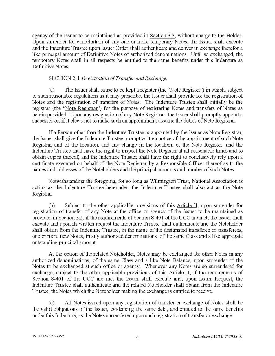 751008852 22727759 4 Indenture (ACMAT 2023 - 1) agency of the Issuer to be maintained as provided in Section 3 . 2 , without charge to the Holder . Upon surrender for cancellation of any one or more temporary Notes, the Issuer shall execute and the Indenture Trustee upon Issuer Order shall authenticate and deliver in exchange therefor a like principal amount of Definitive Notes of authorized denominations . Until so exchanged, the temporary Notes shall in all respects be entitled to the same benefits under this Indenture as Definitive Notes . SECTION 2.4 Registration of Transfer and Exchange . (a) The Issuer shall cause to be kept a register (the “ Note Register ”) in which, subject to such reasonable regulations as it may prescribe, the Issuer shall provide for the registration of Notes and the registration of transfers of Notes . The Indenture Trustee shall initially be the registrar (the “ Note Registrar ”) for the purpose of registering Notes and transfers of Notes as herein provided . Upon any resignation of any Note Registrar, the Issuer shall promptly appoint a successor or, if it elects not to make such an appointment, assume the duties of Note Registrar . If a Person other than the Indenture Trustee is appointed by the Issuer as Note Registrar, the Issuer shall give the Indenture Trustee prompt written notice of the appointment of such Note Registrar and of the location, and any change in the location, of the Note Register, and the Indenture Trustee shall have the right to inspect the Note Register at all reasonable times and to obtain copies thereof, and the Indenture Trustee shall have the right to conclusively rely upon a certificate executed on behalf of the Note Registrar by a Responsible Officer thereof as to the names and addresses of the Noteholders and the principal amounts and number of such Notes . Notwithstanding the foregoing, for so long as Wilmington Trust, National Association is acting as the Indenture Trustee hereunder, the Indenture Trustee shall also act as the Note Registrar . (b) Subject to the other applicable provisions of this Article II , upon surrender for registration of transfer of any Note at the office or agency of the Issuer to be maintained as provided in Section 3 . 2 , if the requirements of Section 8 - 401 of the UCC are met, the Issuer shall execute and upon its written request the Indenture Trustee shall authenticate and the Noteholder shall obtain from the Indenture Trustee, in the name of the designated transferee or transferees, one or more new Notes, in any authorized denominations, of the same Class and a like aggregate outstanding principal amount . At the option of the related Noteholder, Notes may be exchanged for other Notes in any authorized denominations, of the same Class and a like Note Balance, upon surrender of the Notes to be exchanged at such office or agency . Whenever any Notes are so surrendered for exchange, subject to the other applicable provisions of this Article II , if the requirements of Section 8 - 401 of the UCC are met the Issuer shall execute and, upon Issuer Request, the Indenture Trustee shall authenticate and the related Noteholder shall obtain from the Indenture Trustee, the Notes which the Noteholder making the exchange is entitled to receive . (c) All Notes issued upon any registration of transfer or exchange of Notes shall be the valid obligations of the Issuer, evidencing the same debt, and entitled to the same benefits under this Indenture, as the Notes surrendered upon such registration of transfer or exchange .