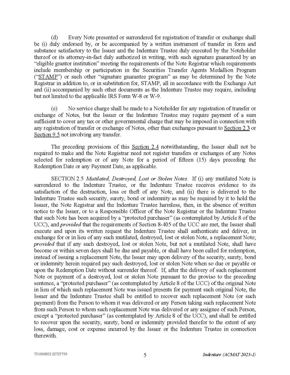 751008852 22727759 5 Indenture (ACMAT 2023 - 1) (d) Every Note presented or surrendered for registration of transfer or exchange shall be (i) duly endorsed by, or be accompanied by a written instrument of transfer in form and substance satisfactory to the Issuer and the Indenture Trustee duly executed by the Noteholder thereof or its attorney - in - fact duly authorized in writing, with such signature guaranteed by an “eligible grantor institution” meeting the requirements of the Note Registrar which requirements include membership or participation in the Securities Transfer Agents Medallion Program (“ STAMP ”) or such other “signature guarantee program” as may be determined by the Note Registrar in addition to, or in substitution for, STAMP, all in accordance with the Exchange Act and (ii) accompanied by such other documents as the Indenture Trustee may require, including but not limited to the applicable IRS Form W - 8 or W - 9 . (e) No service charge shall be made to a Noteholder for any registration of transfer or exchange of Notes, but the Issuer or the Indenture Trustee may require payment of a sum sufficient to cover any tax or other governmental charge that may be imposed in connection with any registration of transfer or exchange of Notes, other than exchanges pursuant to Section 2 . 3 or Section 9 . 5 not involving any transfer . The preceding provisions of this Section 2 . 4 notwithstanding, the Issuer shall not be required to make and the Note Registrar need not register transfers or exchanges of any Notes selected for redemption or of any Note for a period of fifteen ( 15 ) days preceding the Redemption Date or any Payment Date, as applicable . SECTION 2 . 5 Mutilated, Destroyed, Lost or Stolen Notes . If (i) any mutilated Note is surrendered to the Indenture Trustee, or the Indenture Trustee receives evidence to its satisfaction of the destruction, loss or theft of any Note, and (ii) there is delivered to the Indenture Trustee such security, surety, bond or indemnity as may be required by it to hold the Issuer, the Note Registrar and the Indenture Trustee harmless, then, in the absence of written notice to the Issuer, or to a Responsible Officer of the Note Registrar or the Indenture Trustee that such Note has been acquired by a “protected purchaser” (as contemplated by Article 8 of the UCC), and provided that the requirements of Section 8 - 405 of the UCC are met, the Issuer shall execute and upon its written request the Indenture Trustee shall authenticate and deliver, in exchange for or in lieu of any such mutilated, destroyed, lost or stolen Note, a replacement Note ; provided that if any such destroyed, lost or stolen Note, but not a mutilated Note, shall have become or within seven days shall be due and payable, or shall have been called for redemption, instead of issuing a replacement Note, the Issuer may upon delivery of the security, surety, bond or indemnity herein required pay such destroyed, lost or stolen Note when so due or payable or upon the Redemption Date without surrender thereof . If, after the delivery of such replacement Note or payment of a destroyed, lost or stolen Note pursuant to the proviso to the preceding sentence, a “protected purchaser” (as contemplated by Article 8 of the UCC) of the original Note in lieu of which such replacement Note was issued presents for payment such original Note, the Issuer and the Indenture Trustee shall be entitled to recover such replacement Note (or such payment) from the Person to whom it was delivered or any Person taking such replacement Note from such Person to whom such replacement Note was delivered or any assignee of such Person, except a “protected purchaser” (as contemplated by Article 8 of the UCC), and shall be entitled to recover upon the security, surety, bond or indemnity provided therefor to the extent of any loss, damage, cost or expense incurred by the Issuer or the Indenture Trustee in connection therewith .
