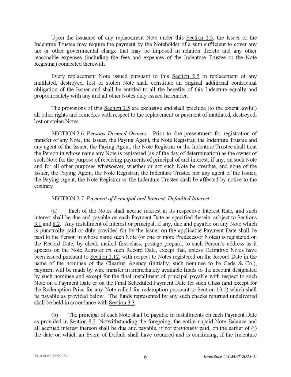 751008852 22727759 6 Indenture (ACMAT 2023 - 1) Upon the issuance of any replacement Note under this Section 2 . 5 , the Issuer or the Indenture Trustee may require the payment by the Noteholder of a sum sufficient to cover any tax or other governmental charge that may be imposed in relation thereto and any other reasonable expenses (including the fees and expenses of the Indenture Trustee or the Note Registrar) connected therewith . Every replacement Note issued pursuant to this Section 2 . 5 in replacement of any mutilated, destroyed, lost or stolen Note shall constitute an original additional contractual obligation of the Issuer and shall be entitled to all the benefits of this Indenture equally and proportionately with any and all other Notes duly issued hereunder . The provisions of this Section 2 . 5 are exclusive and shall preclude (to the extent lawful) all other rights and remedies with respect to the replacement or payment of mutilated, destroyed, lost or stolen Notes . SECTION 2 . 6 Persons Deemed Owners . Prior to due presentment for registration of transfer of any Note, the Issuer, the Paying Agent, the Note Registrar, the Indenture Trustee and any agent of the Issuer, the Paying Agent, the Note Registrar or the Indenture Trustee shall treat the Person in whose name any Note is registered (as of the day of determination) as the owner of such Note for the purpose of receiving payments of principal of and interest, if any, on such Note and for all other purposes whatsoever, whether or not such Note be overdue, and none of the Issuer, the Paying Agent, the Note Registrar, the Indenture Trustee nor any agent of the Issuer, the Paying Agent, the Note Registrar or the Indenture Trustee shall be affected by notice to the contrary . SECTION 2.7 Payment of Principal and Interest; Defaulted Interest. (a) Each of the Notes shall accrue interest at its respective Interest Rate, and such interest shall be due and payable on each Payment Date as specified therein, subject to Sections 3 . 1 and 8 . 2 . Any installment of interest or principal, if any, due and payable on any Note which is punctually paid or duly provided for by the Issuer on the applicable Payment Date shall be paid to the Person in whose name such Note (or one or more Predecessor Notes) is registered on the Record Date, by check mailed first - class, postage prepaid, to such Person’s address as it appears on the Note Register on such Record Date, except that, unless Definitive Notes have been issued pursuant to Section 2 . 12 , with respect to Notes registered on the Record Date in the name of the nominee of the Clearing Agency (initially, such nominee to be Cede & Co . ), payment will be made by wire transfer in immediately available funds to the account designated by such nominee and except for the final installment of principal payable with respect to such Note on a Payment Date or on the Final Scheduled Payment Date for such Class (and except for the Redemption Price for any Note called for redemption pursuant to Section 10 . 1 ) which shall be payable as provided below . The funds represented by any such checks returned undelivered shall be held in accordance with Section 3 . 3 . (b) The principal of each Note shall be payable in installments on each Payment Date as provided in Section 8 . 2 . Notwithstanding the foregoing, the entire unpaid Note Balance and all accrued interest thereon shall be due and payable, if not previously paid, on the earlier of (i) the date on which an Event of Default shall have occurred and is continuing, if the Indenture