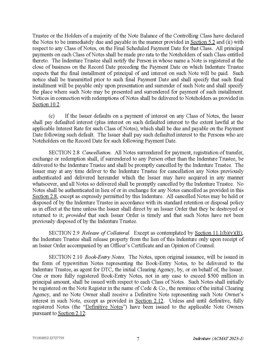 751008852 22727759 7 Indenture (ACMAT 2023 - 1) Trustee or the Holders of a majority of the Note Balance of the Controlling Class have declared the Notes to be immediately due and payable in the manner provided in Section 5 . 2 and (ii) with respect to any Class of Notes, on the Final Scheduled Payment Date for that Class . All principal payments on each Class of Notes shall be made pro rata to the Noteholders of such Class entitled thereto . The Indenture Trustee shall notify the Person in whose name a Note is registered at the close of business on the Record Date preceding the Payment Date on which Indenture Trustee expects that the final installment of principal of and interest on such Note will be paid . Such notice shall be transmitted prior to such final Payment Date and shall specify that such final installment will be payable only upon presentation and surrender of such Note and shall specify the place where such Note may be presented and surrendered for payment of such installment . Notices in connection with redemptions of Notes shall be delivered to Noteholders as provided in Section 10 . 2 . (c) If the Issuer defaults on a payment of interest on any Class of Notes, the Issuer shall pay defaulted interest (plus interest on such defaulted interest to the extent lawful at the applicable Interest Rate for such Class of Notes), which shall be due and payable on the Payment Date following such default . The Issuer shall pay such defaulted interest to the Persons who are Noteholders on the Record Date for such following Payment Date . SECTION 2 . 8 Cancellation . All Notes surrendered for payment, registration of transfer, exchange or redemption shall, if surrendered to any Person other than the Indenture Trustee, be delivered to the Indenture Trustee and shall be promptly cancelled by the Indenture Trustee . The Issuer may at any time deliver to the Indenture Trustee for cancellation any Notes previously authenticated and delivered hereunder which the Issuer may have acquired in any manner whatsoever, and all Notes so delivered shall be promptly cancelled by the Indenture Trustee . No Notes shall be authenticated in lieu of or in exchange for any Notes cancelled as provided in this Section 2 . 8 , except as expressly permitted by this Indenture . All cancelled Notes may be held or disposed of by the Indenture Trustee in accordance with its standard retention or disposal policy as in effect at the time unless the Issuer shall direct by an Issuer Order that they be destroyed or returned to it ; provided that such Issuer Order is timely and that such Notes have not been previously disposed of by the Indenture Trustee . SECTION 2 . 9 Release of Collateral . Except as contemplated by Section 11 . 1 (b)(v)(B) , the Indenture Trustee shall release property from the lien of this Indenture only upon receipt of an Issuer Order accompanied by an Officer’s Certificate and an Opinion of Counsel . SECTION 2 . 10 Book - Entry Notes . The Notes, upon original issuance, will be issued in the form of typewritten Notes representing the Book - Entry Notes, to be delivered to the Indenture Trustee, as agent for DTC, the initial Clearing Agency, by, or on behalf of, the Issuer . One or more fully registered Book - Entry Notes, not in any case to exceed $ 500 million in principal amount, shall be issued with respect to each Class of Notes . Such Notes shall initially be registered on the Note Register in the name of Cede & Co . , the nominee of the initial Clearing Agency, and no Note Owner shall receive a Definitive Note representing such Note Owner’s interest in such Note, except as provided in Section 2 . 12 . Unless and until definitive, fully registered Notes (the “ Definitive Notes ”) have been issued to the applicable Note Owners pursuant to Section 2 . 12 :